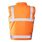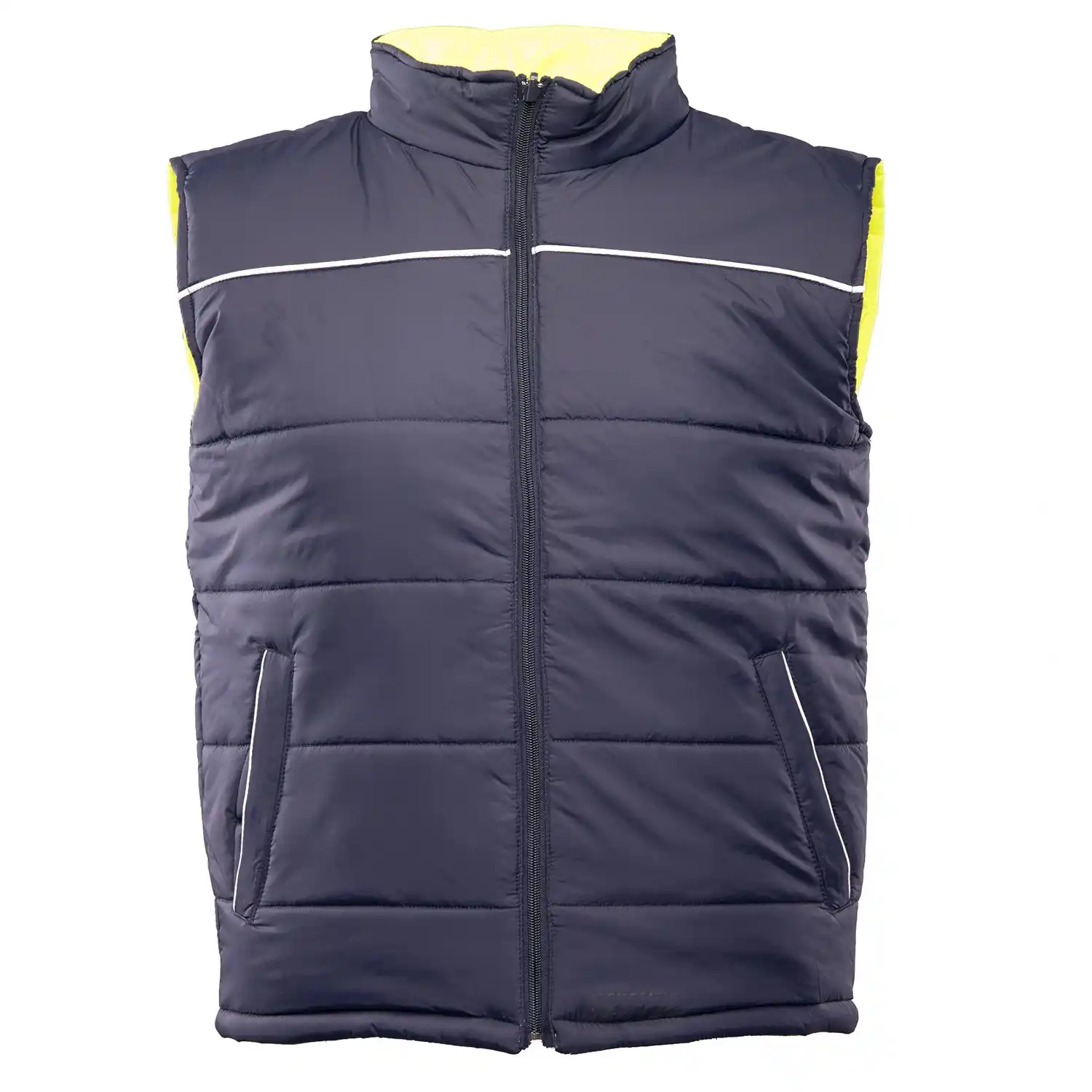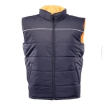 o gramaturze 160 g/m², posiada przepikowaną ocieplinę poliestrową o gramaturze 200 g/m², która zapewnia optymalny komfort termiczny bez zbędnego obciążenia sylwetki. Głównym atutem modelu jest jego wszechstronność: jedna strona (w kolorze żółtym/pomarańczowym) wyposażona jest w elementy odblaskowe oraz dwie kieszenie zapinane na zamek i kryte listwą, co zwiększa widoczność i bezpieczeństwo. Druga strona (granatowa) oferuje bardziej stonowany, klasyczny wygląd z dwiema kieszeniami bocznymi zakończonymi patką