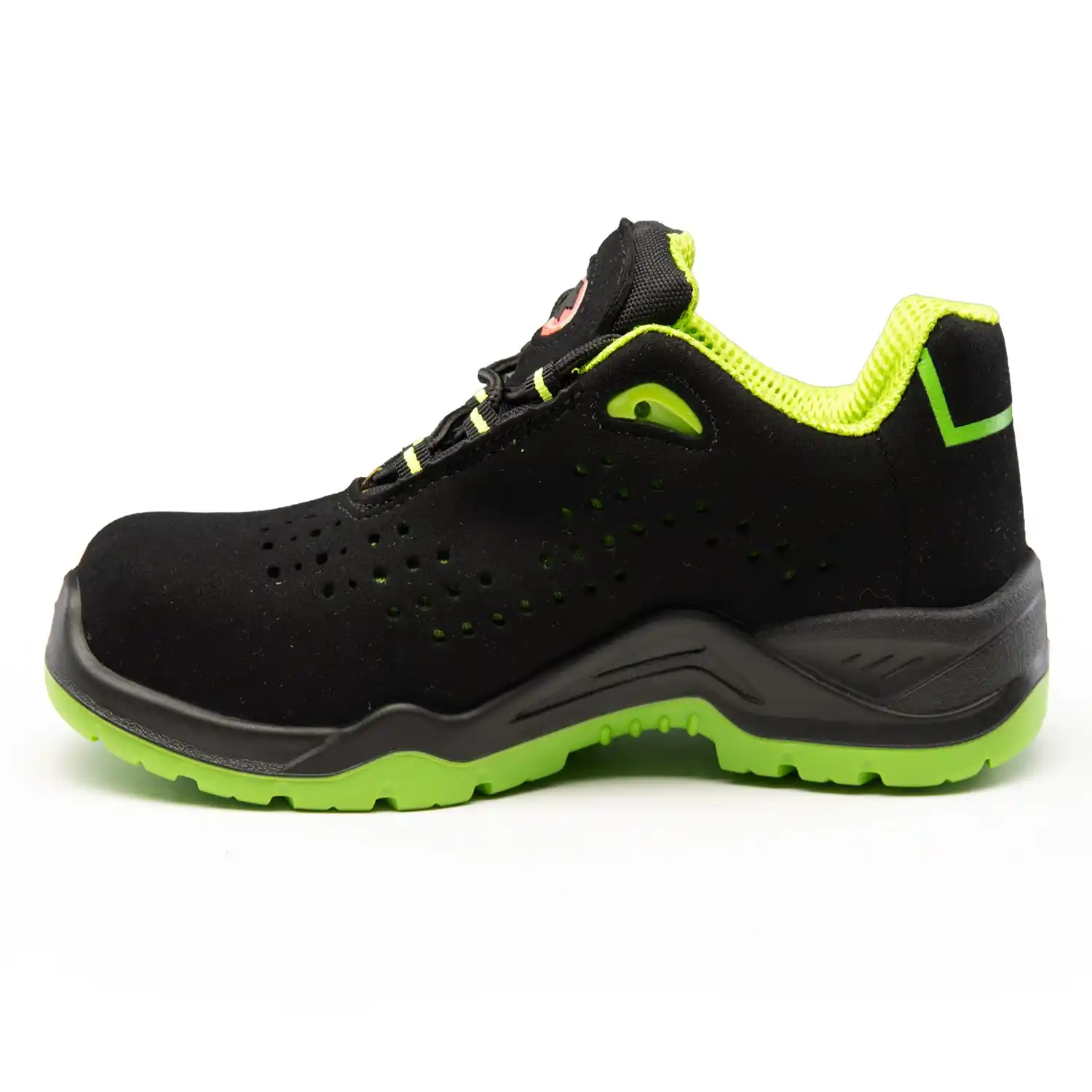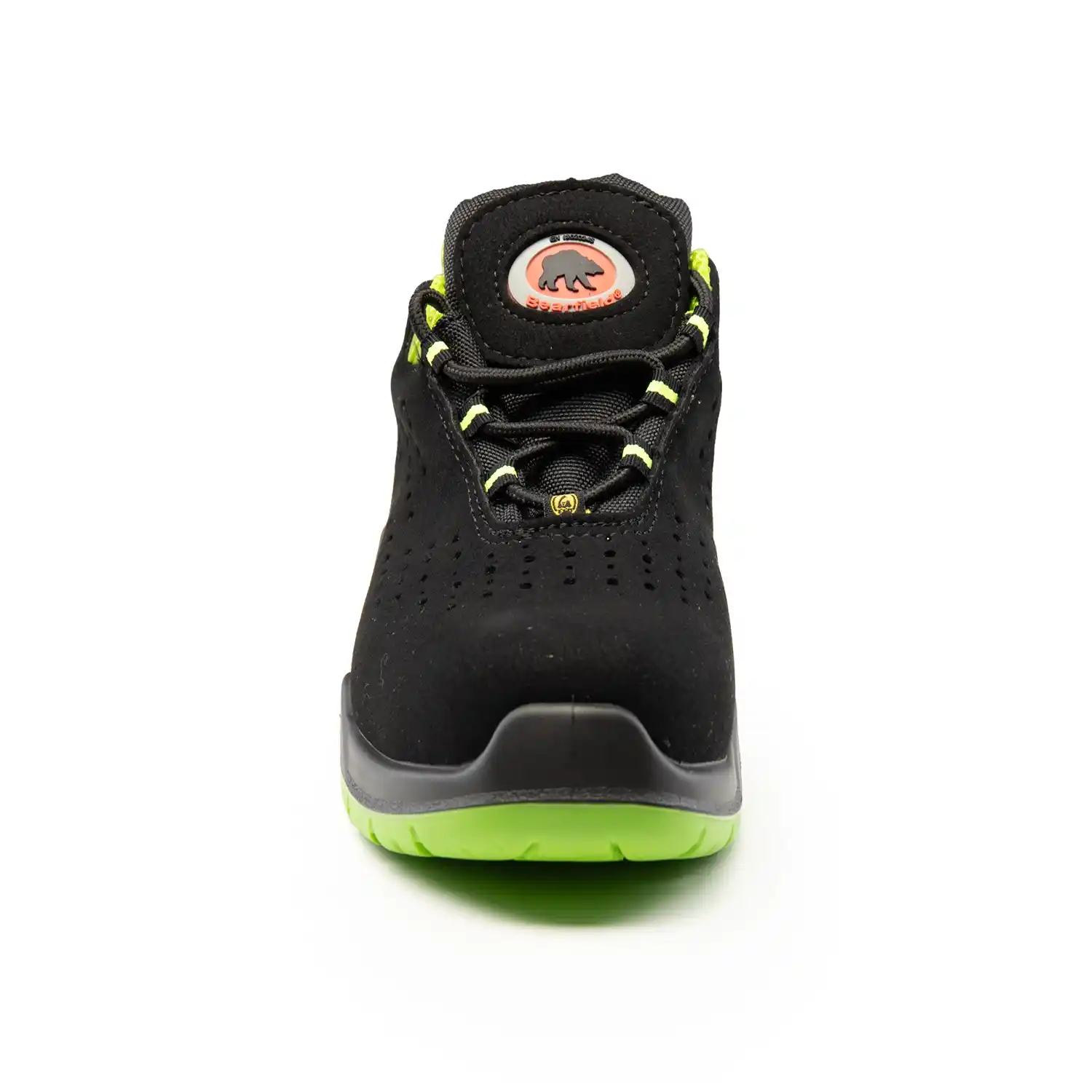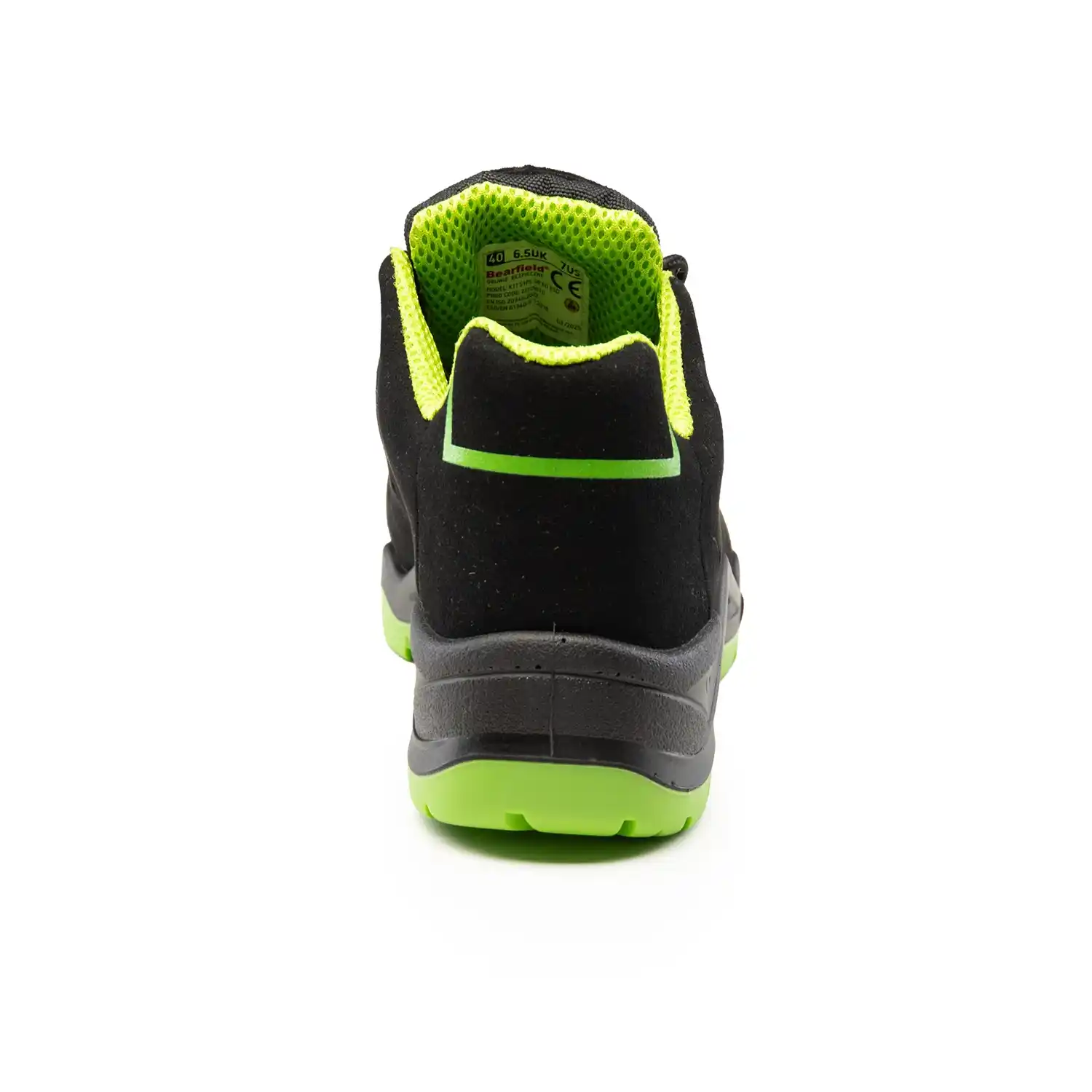 Specjalistyczne półbuty robocze marki Bearfield to wiązane obuwie ochronne sklasyfikowane w kategorii S1-P, charakteryzujące się konstrukcją całkowicie pozbawioną elementów metalowych (Metal-Free). Wierzchnia część buta została wykonana z innowacyjnej mikrofibry o grubości od 1,8 do 2,0 mm, a dodatkowe otwory w strukturze materiału znacząco zwiększają wentylację stopy podczas intensywnej pracy. Wnętrze obuwia wyposażono w higroskopijną wyściółkę z przewiewnej tkaniny, która doskonale wchłania pot i skutecznie zapobiega powstawaniu uciążliwych otarć. Komfort codziennego użytkowania znacząco podnosi również wymienna wkładka oraz gruby, miękki miechowy język. Solidną ochronę palców przed uderzeniami z energią 200 J oraz zgnieceniami do 15 kN gwarantuje wytrzymały, kompozytowy podnosek. Z kolei przed niebezpiecznym przekłuciem o nacisku 1100N stopę od spodu chroni kompozytowa wkładka antyprzebiciowa. Stabilność i pewność każdego kroku zapewnia podeszwa o podwójnej gęstości z PU/TPU, wykazująca właściwości antypoślizgowe klasy SRC. Podeszwa ta charakteryzuje się pełną odpornością na olej napędowy (FO), posiada niezbędne właściwości antyelektrostatyczne i oferuje funkcję absorpcji energii w części piętowej. Niezwykle istotnym atutem tego modelu są zaawansowane właściwości antystatyczne ESD, co potwierdza zgodność obuwia z rygorystycznymi normami EN ISO 20345 oraz