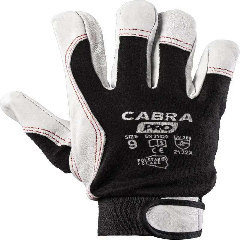 Ochronne rękawice robocze CABRA, zaklasyfikowane jako środek ochrony indywidualnej kategorii II, to solidny produkt gwarantujący wysoki komfort pracy. Bazę tego modelu stanowi wygodna i wytrzymała bawełniana dzianina interlock. Dla zwiększenia trwałości, część dłoniowa odzieży, w tym newralgiczne miejsca takie jak kciuk i palec wskazujący, zostały wykonane z wysokiej jakości koziej skóry licowej. Pewne ułożenie na ręce oraz skuteczną ochronę przed zsuwaniem się podczas wykonywania obowiązków zapewnia elastyczny ściągacz zapinany na praktyczny rzep. Rękawice te spełniają rygorystyczne wymagania norm EN ISO 21420:2020 oraz