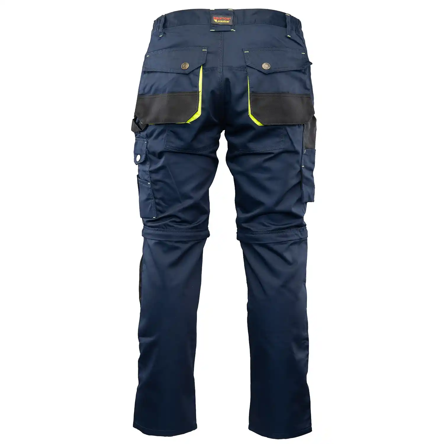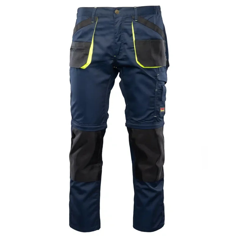 na stanowisku pracy. Uszyte z wysokiej jakości elanobawełny (65% poliester, 35% bawełna) o optymalnej gramaturze 260 g/m², zapewniają doskonałą stabilność rozmiarów oraz odporność na blaknięcie po wielokrotnym praniu. Najważniejszą cechą tego modelu są ukryte pod patką zamki, które pozwalają w kilka sekund przekształcić długie spodnie w wygodne, przewiewne szorty. Pomimo funkcji „2w1”, spodnie zachowują pancerną konstrukcję charakterystyczną dla linii Practical: posiadają podwójne i potrójne szwy szyte mocną nicią, liczne ryglówki, wzmocnienia na pośladkach oraz ergonomiczne kieszenie na nakolanniki wykonane z nieścieralnego materiału OXFORD. Użytkownik ma do dyspozycji system przestrzennych, wzmocnionych kieszeni (w tym bezpieczną kieszeń na zamek, schowek na telefon, miarkę „metrówkę” i długopisy) oraz praktyczną szlufkę na młotek. Elastyczna gumka w pasie oraz szlufki na pasek zapewniają idealne dopasowanie do sylwetki. Model w pełni odpowiada normie EN ISO 13688:2013.