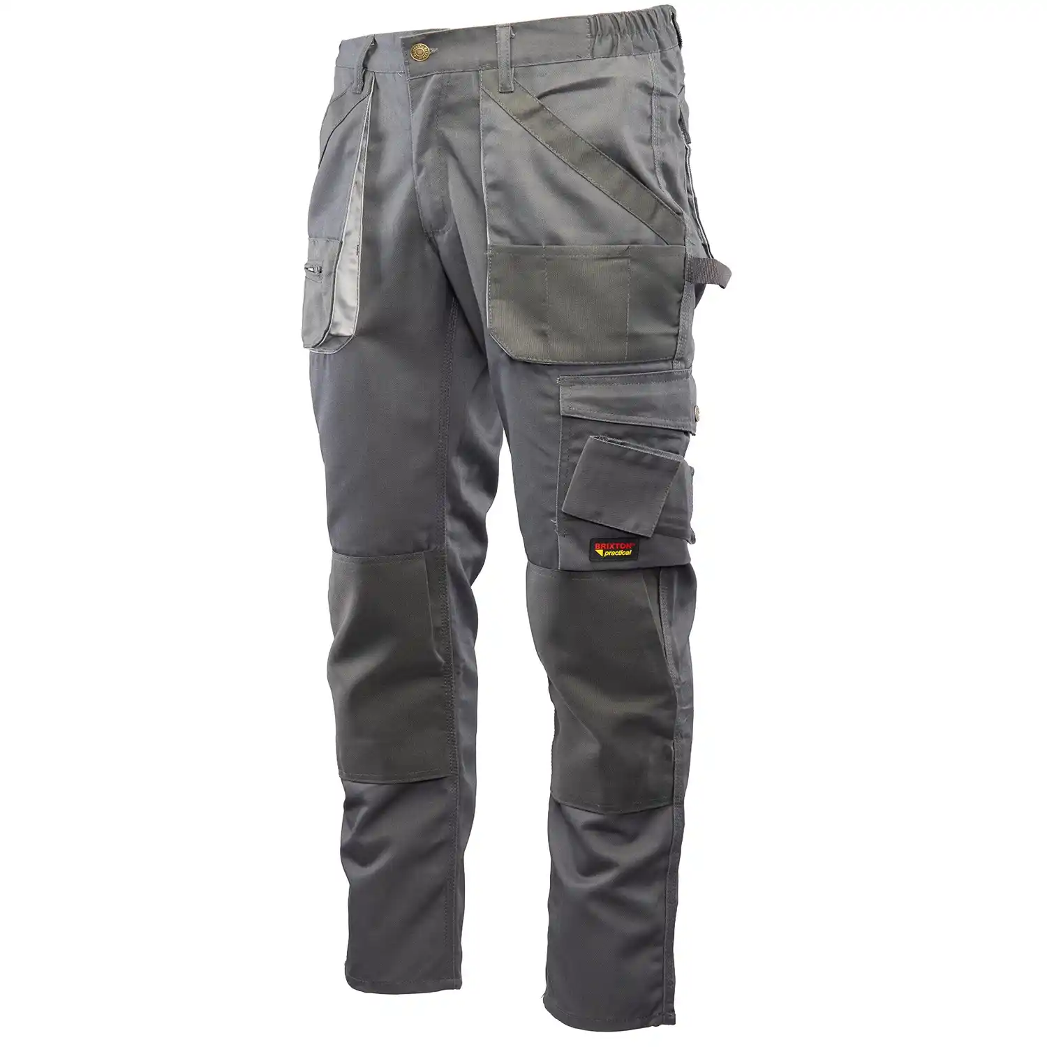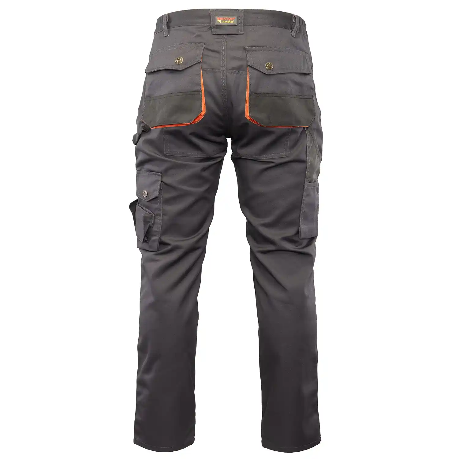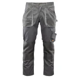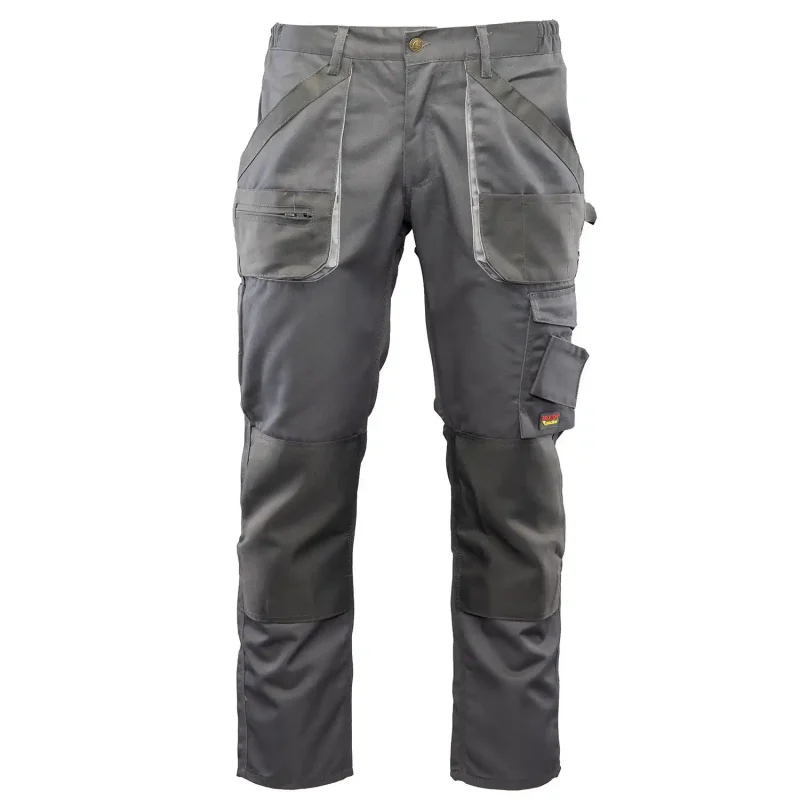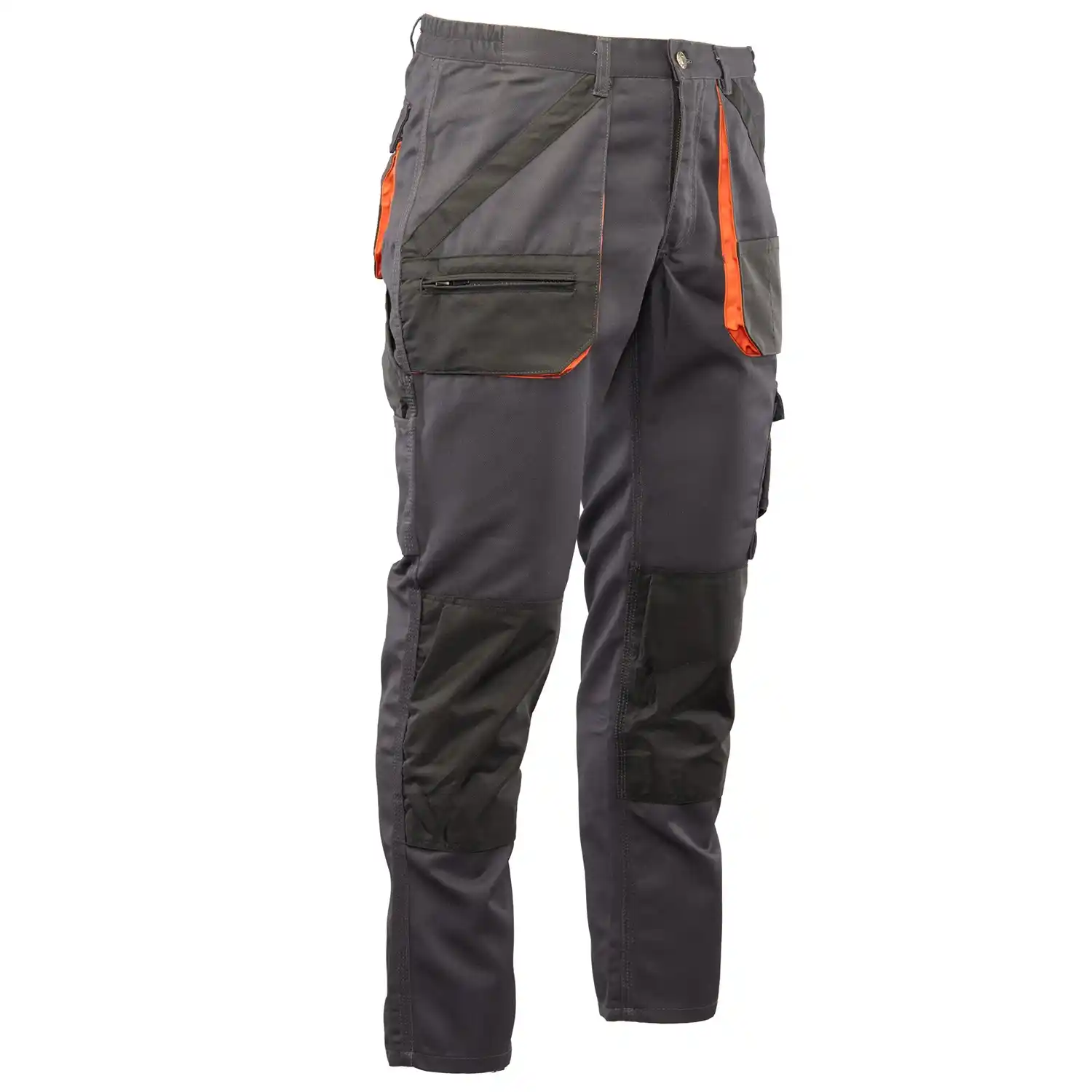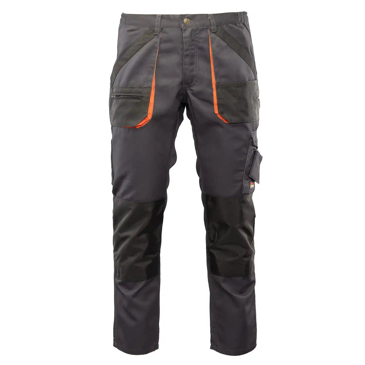 na nakolanniki wykonane z ekstremalnie odpornego na ścieranie materiału OXFORD. Użytkownik ma do dyspozycji system rozbudowanych i przestrzennych kieszeni: wzmocnione kieszenie boczne, dwie kieszenie tylne, bezpieczną kieszeń zapinaną na zamek, schowek na telefon, miarkę „metrówkę” oraz dwie kieszonki na długopisy. Całość wyposażono w szlufki na pasek, szlufkę na młotek oraz elastyczną gumkę w pasie, co ułatwia dopasowanie spodni do sylwetki. Model ten spełnia wymogi normy EN ISO 13688:2013, oferując najwyższy standard odzieży roboczej.