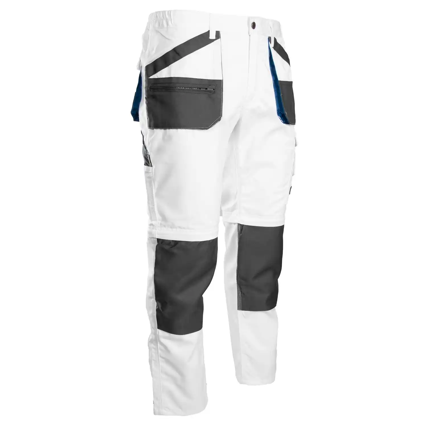 o maksymalnej adaptacji do zmiennych warunków pracy. Wykonane z solidnej mieszanki poliestru (65%) i bawełny (35%) o gramaturze 260 g/m², gwarantują utrzymanie stabilności rozmiarów i śnieżnobiałego koloru nawet po wielokrotnym praniu. Największym atutem tego modelu są odpinane nogawki, które pozwalają w kilka sekund przekształcić długie spodnie w wygodne szorty. Konstrukcja jest przygotowana na intensywne użytkowanie: zastosowano podwójne i potrójne szwy szyte mocną nicią, liczne ryglówki zapobiegające rozpruciu oraz dodatkowe wzmocnienie na pośladkach chroniące przed przetarciem. Ochronę kolan zapewniają ergonomiczne kieszenie na nakolanniki wykonane z ekstremalnie wytrzymałego materiału OXFORD. Użytkownik ma do dyspozycji system rozbudowanych i przestrzennych kieszeni: wzmocnione kieszenie boczne, tylne, bezpieczną kieszeń