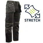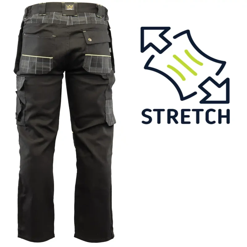 Elastyczne spodnie robocze do pasa marki Seven Kings, spełniające wymagania normy EN 13688, wykonane są z wysokiej jakości tkaniny o gramaturze 300 g/m² (skład: 97% bawełna, 3% spandex). Zastosowanie spandexu sprawia, że są to spodnie typu stretch, które współpracują z ruchem ciała, a solidny materiał gwarantuje stabilność rozmiarów nawet po wielokrotnym praniu. Trwałość konstrukcji podnoszą podwójne szwy szyte widoczną, mocną nicią oraz duża liczba ryglówek w miejscach szczególnie narażonych na rozprucie. Model wyróżnia się nowoczesnym wzornictwem, wykorzystując wstawki z materiału w modną kratkę oraz kontrastową lamówkę, która jednocześnie zwiększa widoczność użytkownika. Dopasowany krój i optymalne przyleganie do sylwetki zapewnia elastyczna gumka w pasie oraz szlufki na pasek. Newralgiczne strefy kolan zabezpieczono za pomocą ergonomicznych kieszeni na nakolanniki, wykonanych z wysoce odpornego na przetarcia materiału Cordura. Wyjątkową funkcjonalność modelu zapewnia rozbudowany system schowków, w tym dwie odpinane kieszenie monterskie, wzmocnione kieszenie boczne, dwie kieszenie w tylnej części, a także dedykowane miejsca na telefon komórkowy, dokumenty, miarkę „metrówkę” oraz szlufka na młotek.