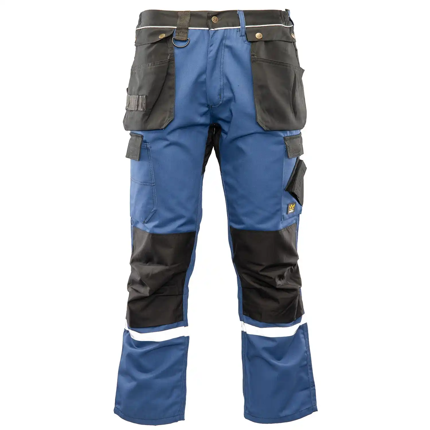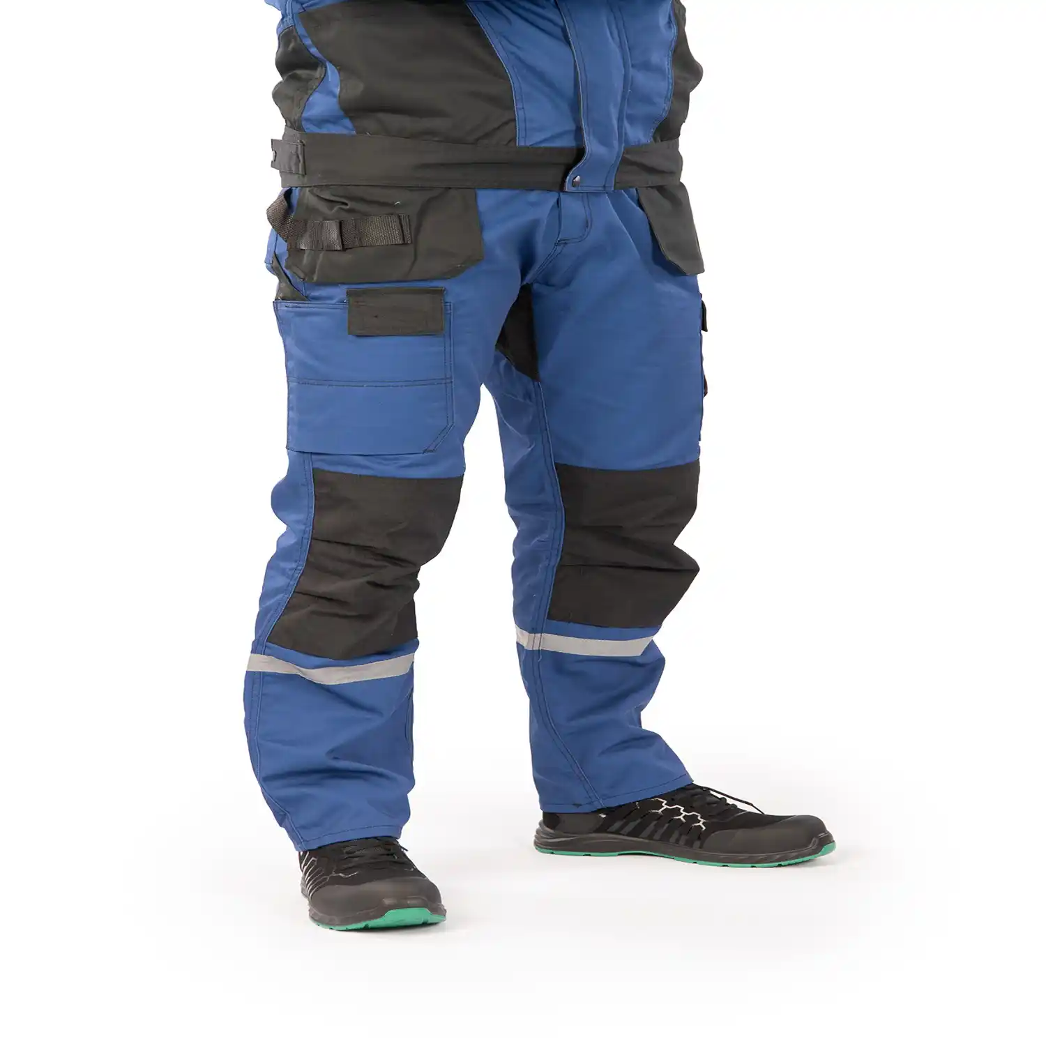 z odpornego na przetarcia materiału Cordura. Spodnie posiadają elastyczny pas z gumką oraz szlufki, co pozwala na optymalne dopasowanie do sylwetki. Wyjątkową funkcjonalność modelu gwarantują dwie odpinane kieszenie monterskie, wzmocnione kieszenie boczne i tylne, a także dedykowane miejsca na telefon, dokumenty, długopisy, miarkę „metrówkę” oraz szlufka na młotek. Bezpieczeństwo użytkowania podnoszą pasy odblaskowe u dołu nogawek oraz lamówka odblaskowa.