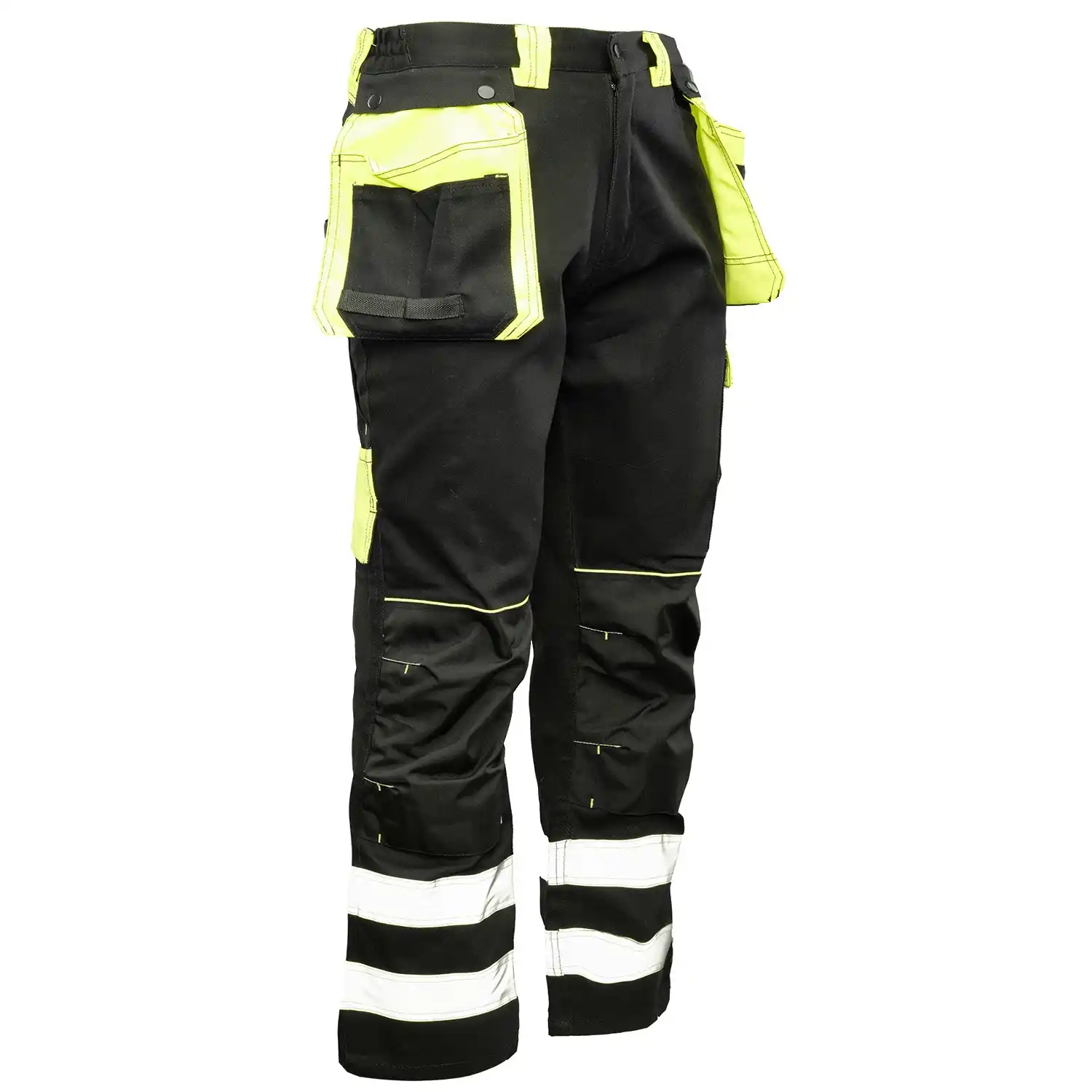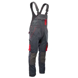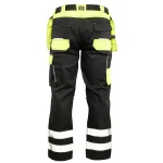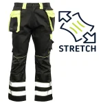 Wyjątkową funkcjonalność zapewnia rozbudowany system schowków: dwie odpinane kieszenie monterskie, wzmocnione kieszenie boczne, dwie kieszenie w tylnej części oraz dedykowane miejsca na telefon komórkowy, dokumenty i miarkę „metrówkę”. Bezpieczeństwo i widoczność użytkownika w trudnych warunkach znacznie zwiększają pasy odblaskowe oraz lamówka odblaskowa. Estetykę wykończenia podkreślają materiałowe wstawki.