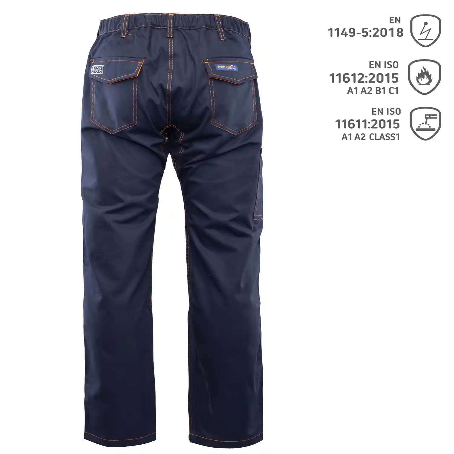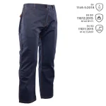 z wysokiej jakości bawełny o gramaturze 320 g/m², co gwarantuje wyjątkową trwałość materiału oraz zachowanie stabilności rozmiarów nawet po wielokrotnym praniu. W trosce o najwyższy komfort i pełną swobodę ruchów użytkownika, model ten posiada dopasowany krój z wszytym klinem w kroku oraz elastyczną gumką w pasie, która umożliwia wygodną regulację obwodu. Wysoką wytrzymałość konstrukcji zapewniają podwójne szwy wykonane widoczną, mocną nicią oraz obecność dużej ilości ryglówek w newralgicznych miejscach. Funkcjonalność odzieży podczas pracy podnoszą praktyczne szlufki na pasek oraz przemyślany system schowków, na który składają się dwie wzmocnione kieszenie boczne, dwie kieszenie umiejscowione z tyłu oraz specjalna kieszeń na miarkę typu „metrówka”. Spodnie te spełniają rygorystyczne wymagania dla specjalistycznej odzieży ochronnej, co w pełni potwierdzają normy EN ISO 13688:2013 i EN 1149-5:2018 (właściwości antyelektrostatyczne), a także normy określające ochronę przed czynnikami gorącymi, płomieniem i dla procesów spawalniczych: