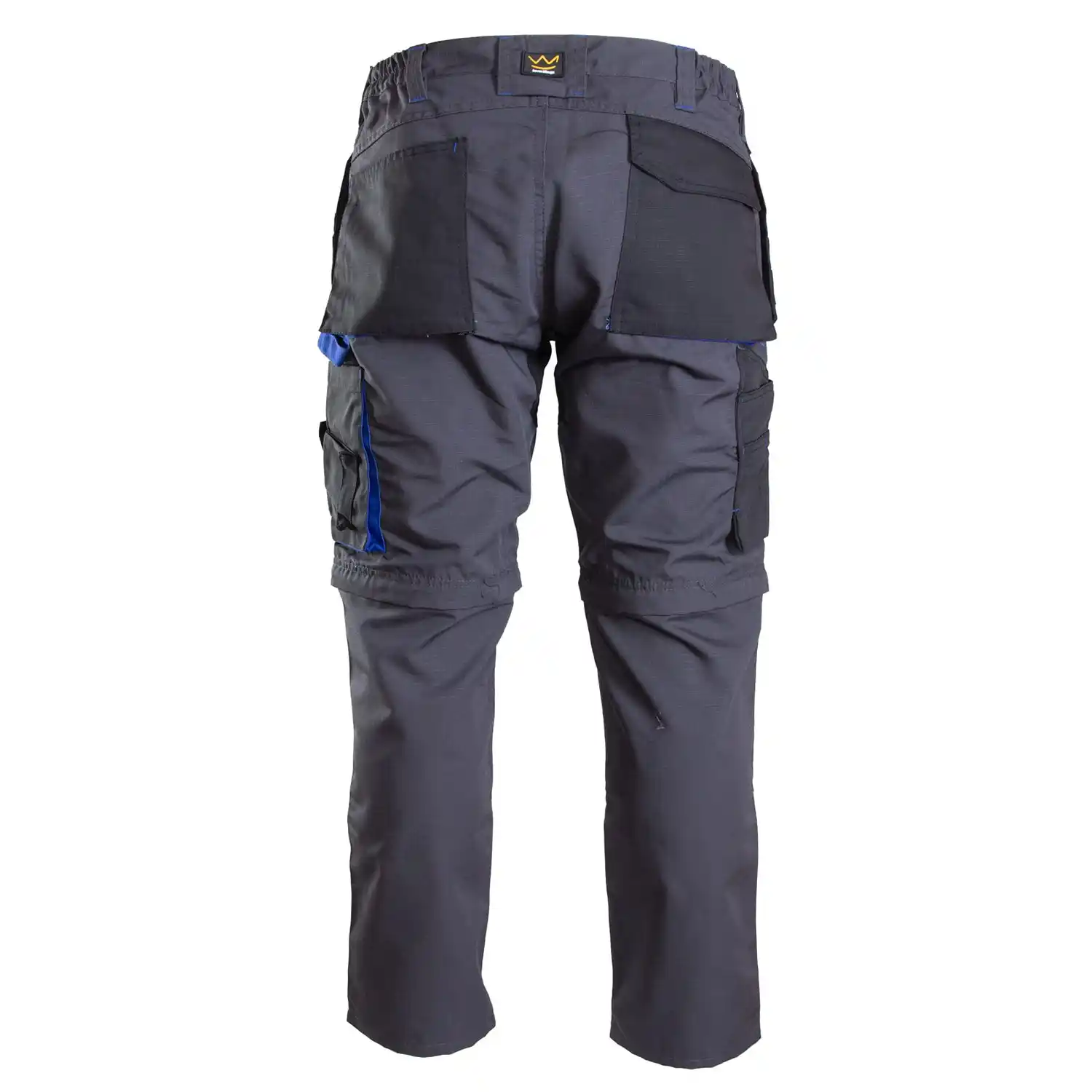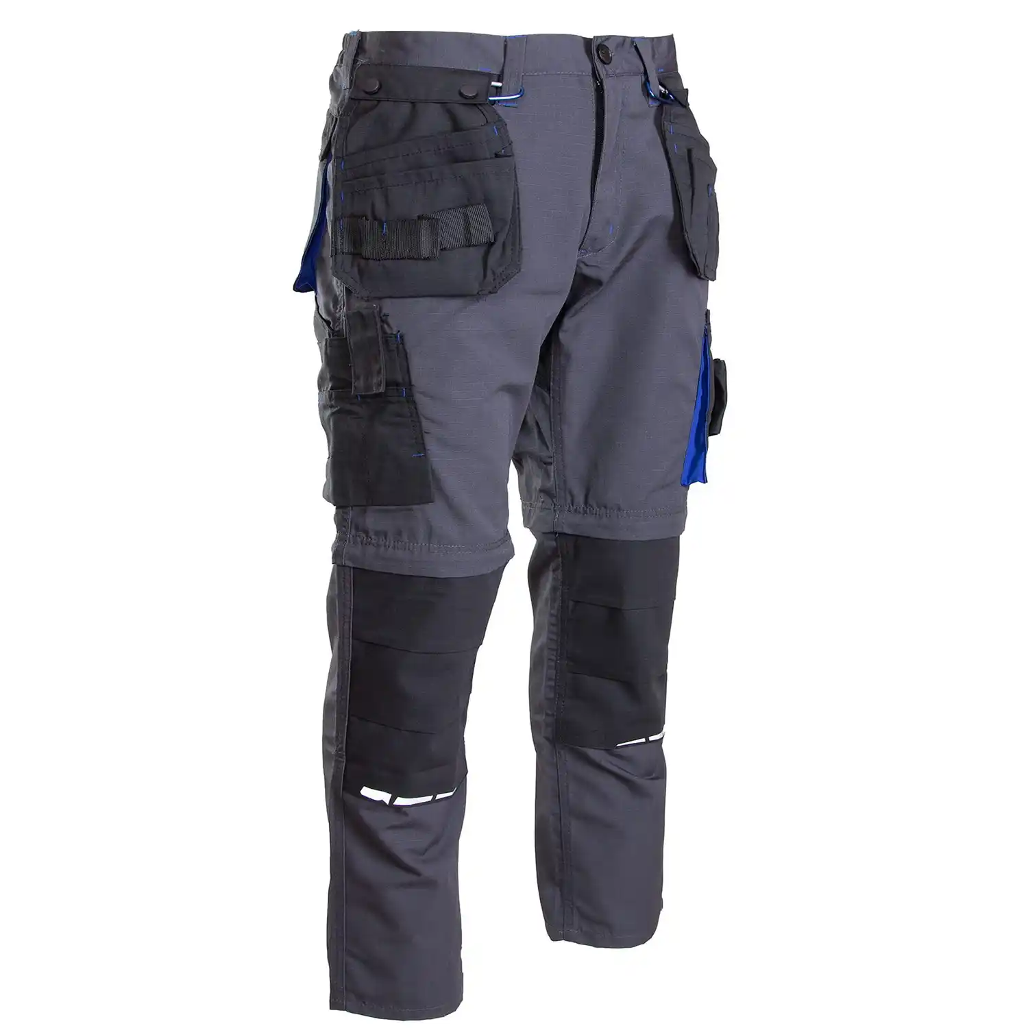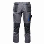 Spodnie robocze Seven Kings wykonane z tkaniny typu rip-stop o gramaturze 260 g/m² i składzie 65% poliester, 35% bawełna, faktura kratki 6x6mm zapobiega rozdzieraniu materiału. Konstrukcja zgodna z normą EN 13688 obejmuje odpinane nogawki, klin ze stretchu w kroku zwiększający swobodę ruchów oraz wzmocnienia w postaci podwójnych szwów i licznych ryglówek. Model wyposażono w system funkcjonalnych kieszeni, w tym dwie dopinane na zamek kieszenie monterskie, ergonomiczne kieszenie na nakolanniki, wzmocnione kieszenie boczne oraz dedykowane miejsca na telefon, dokumenty i miarkę. Dodatkowe elementy techniczne to regulacja obwodu