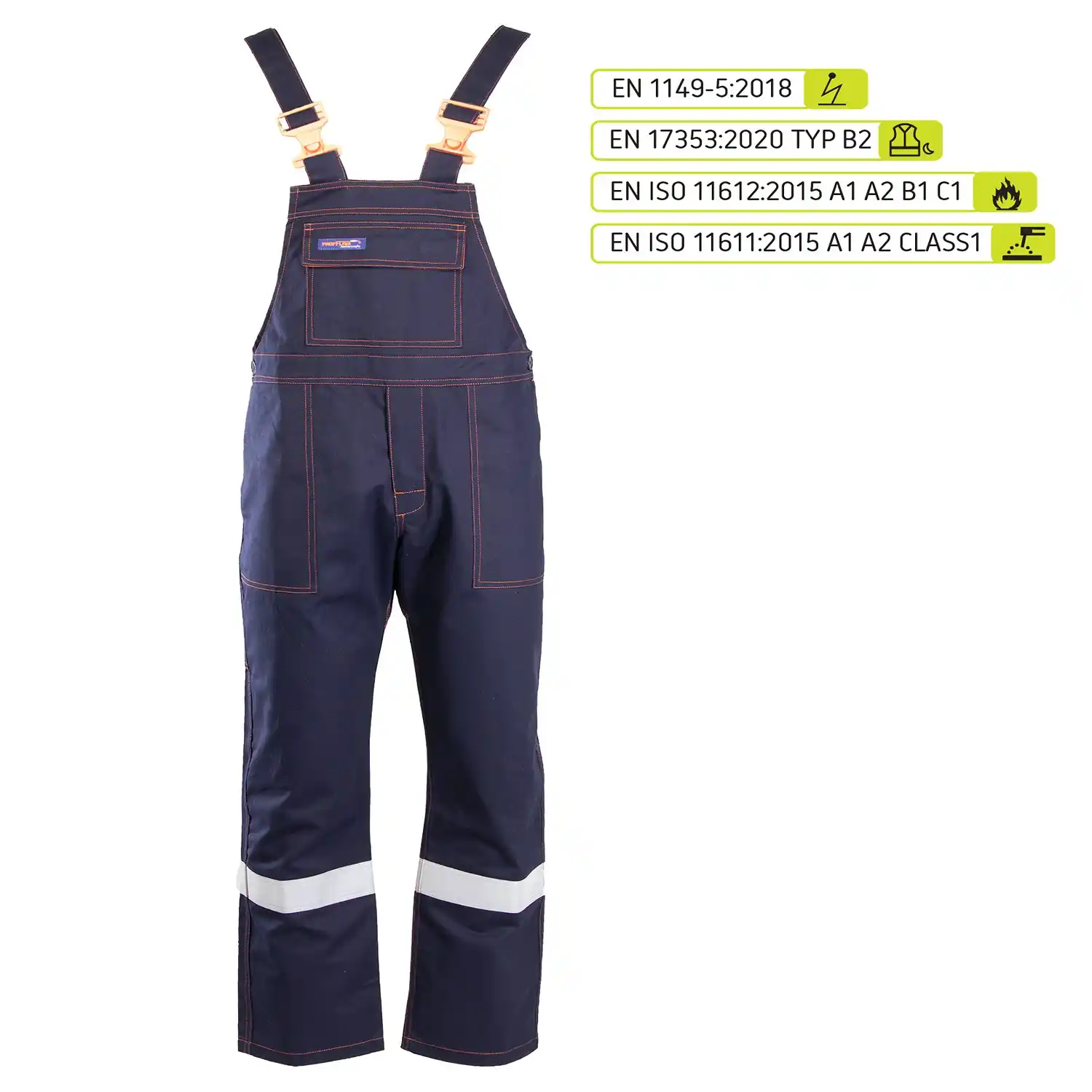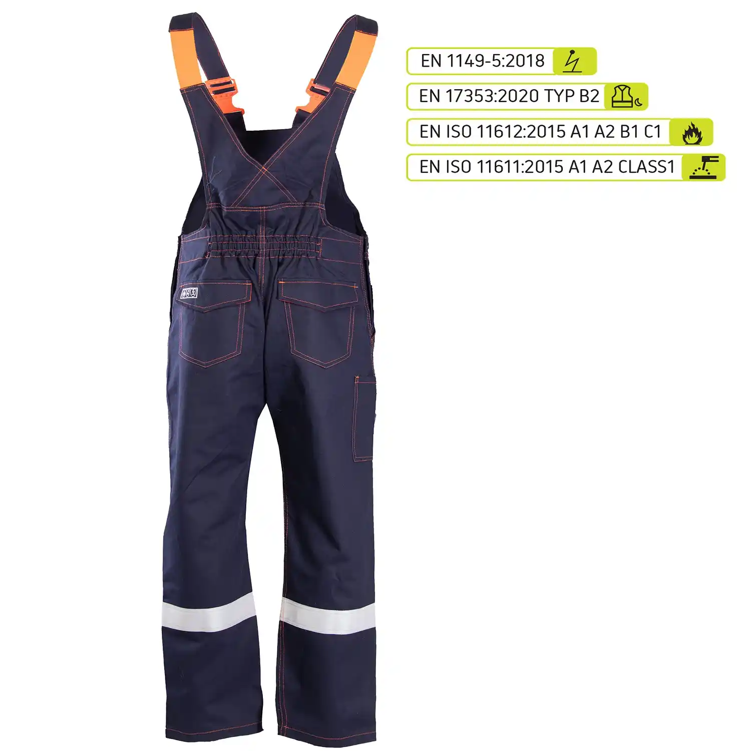 EN ISO 13688:2013 oraz EN 1149-5:2018, a także standardy określające ochronę przed czynnikami gorącymi, płomieniem i dla procesów spawalniczych: EN ISO 11612:2015 A1 A2 B1 C1 i EN ISO 11611:2015 A1 A2 CLASS 1. Dodatkowo certyfikacja EN 17353:2020 TYP B2 gwarantuje odpowiednią widzialność użytkownika w sytuacjach podwyższonego ryzyka.