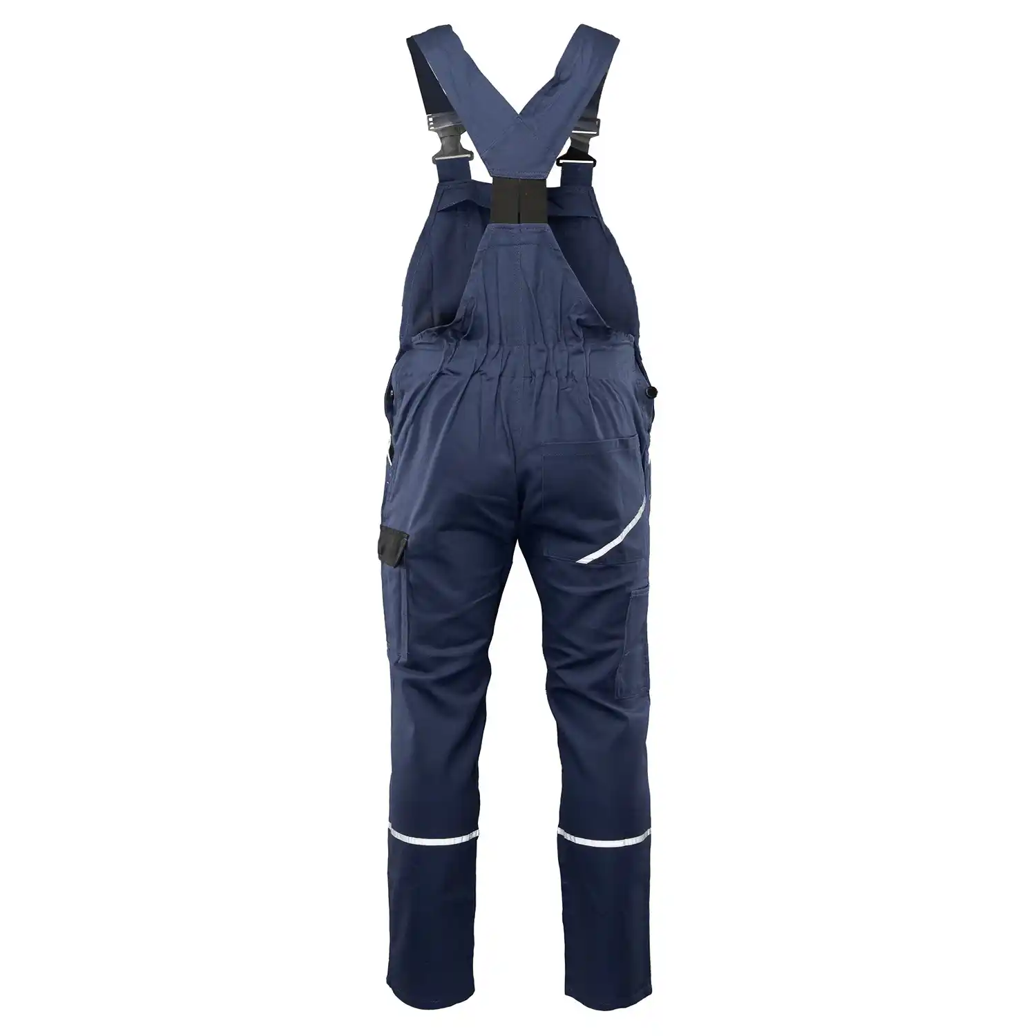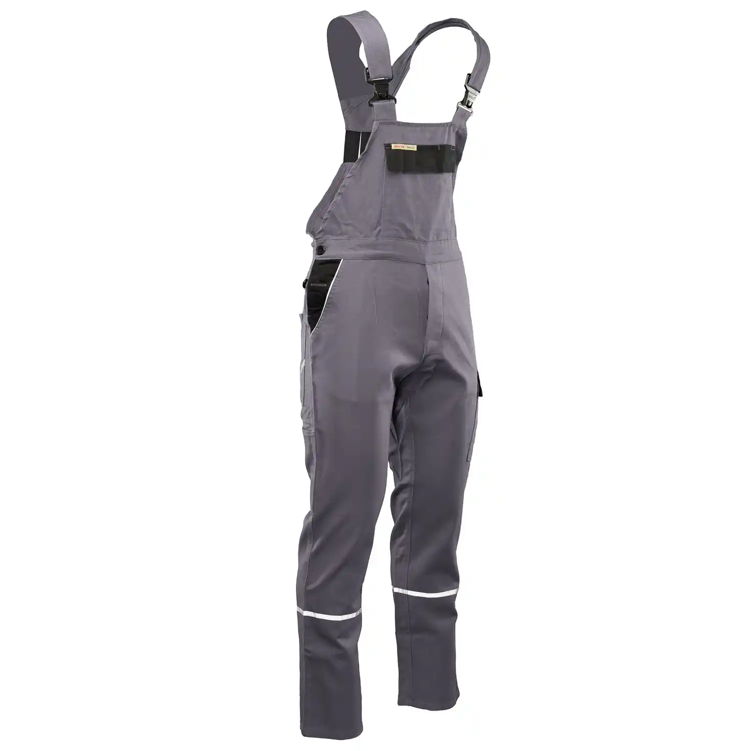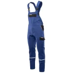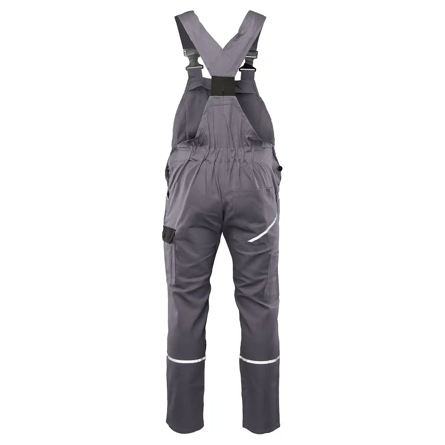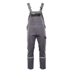 i charakteryzuje się wysoką stabilnością rozmiarów po praniu. Konstrukcja ogrodniczek zapewnia pełną swobodę ruchów dzięki systemowi regulacji – posiadają długie, łatwo regulowane szelki, wszytą w tylnej części pasa gumkę ściągającą oraz możliwość dodatkowej regulacji obwodu za pomocą guzików po bokach. Funkcjonalność modelu podnosi praktyczny układ kieszeni: obszerne kieszenie boczne, wzmocniona kieszeń tylna, duża kieszeń na klatce piersiowej zapinana na rzep oraz dedykowana kieszeń na dokumenty. Wyróżniającym elementem są pasy i lamówki odblaskowe umieszczone u spodu nogawek, które dyskretnie, ale skutecznie poprawiają widoczność pracownika po zmroku. Spodnie posiadają certyfikat zgodności z normą EN ISO 13688:2013, potwierdzający ich najwyższą jakość i bezpieczeństwo użytkowania.