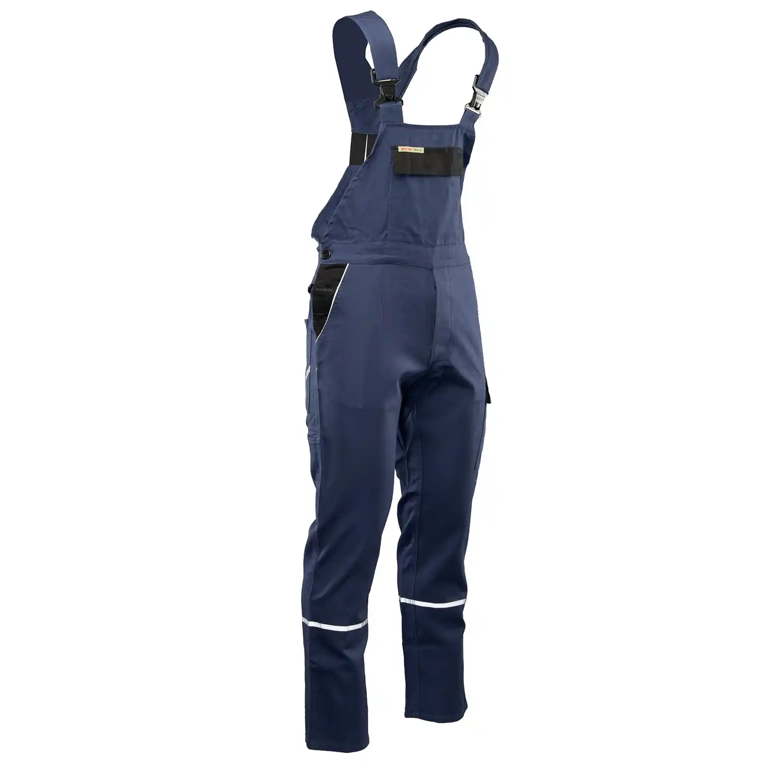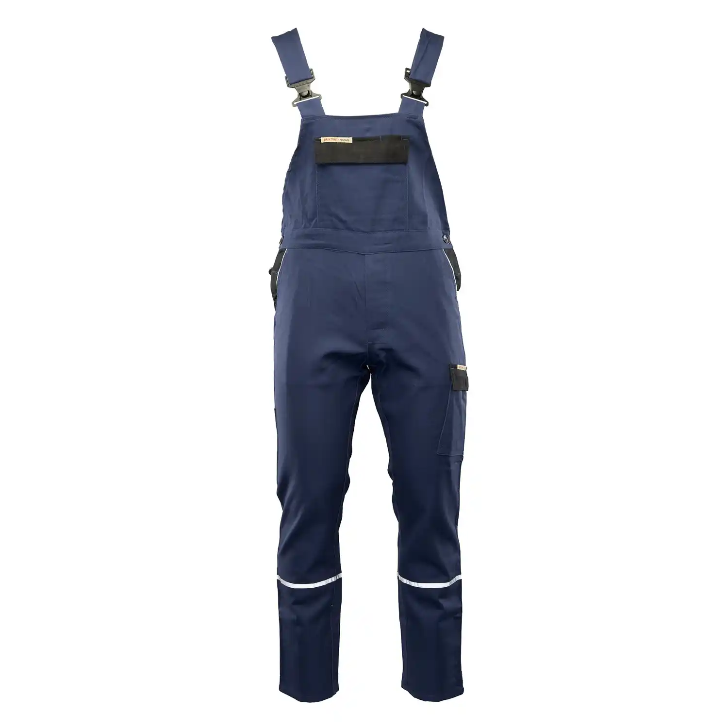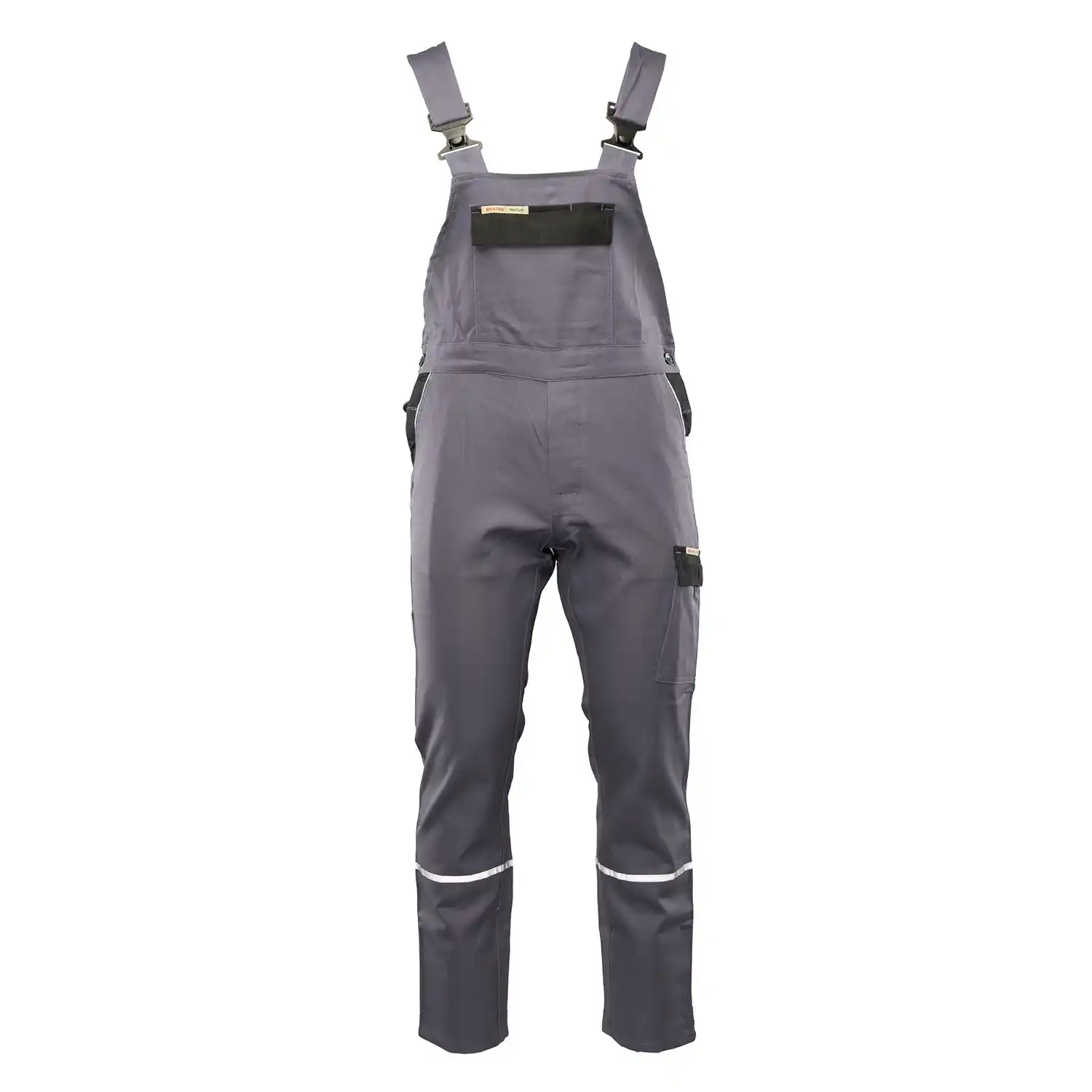 i charakteryzuje się wysoką stabilnością rozmiarów po praniu. Konstrukcja ogrodniczek zapewnia pełną swobodę ruchów dzięki systemowi regulacji – posiadają długie, łatwo regulowane szelki, wszytą w tylnej części pasa gumkę ściągającą oraz możliwość dodatkowej regulacji obwodu za pomocą guzików po bokach. Funkcjonalność modelu podnosi praktyczny układ kieszeni: obszerne kieszenie boczne, wzmocniona kieszeń tylna, duża kieszeń na klatce piersiowej zapinana na rzep oraz dedykowana kieszeń na dokumenty. Wyróżniającym elementem są pasy i lamówki odblaskowe umieszczone u spodu nogawek, które dyskretnie, ale skutecznie poprawiają widoczność pracownika po zmroku. Spodnie posiadają certyfikat zgodności z normą EN ISO 13688:2013, potwierdzający ich najwyższą jakość i bezpieczeństwo użytkowania.