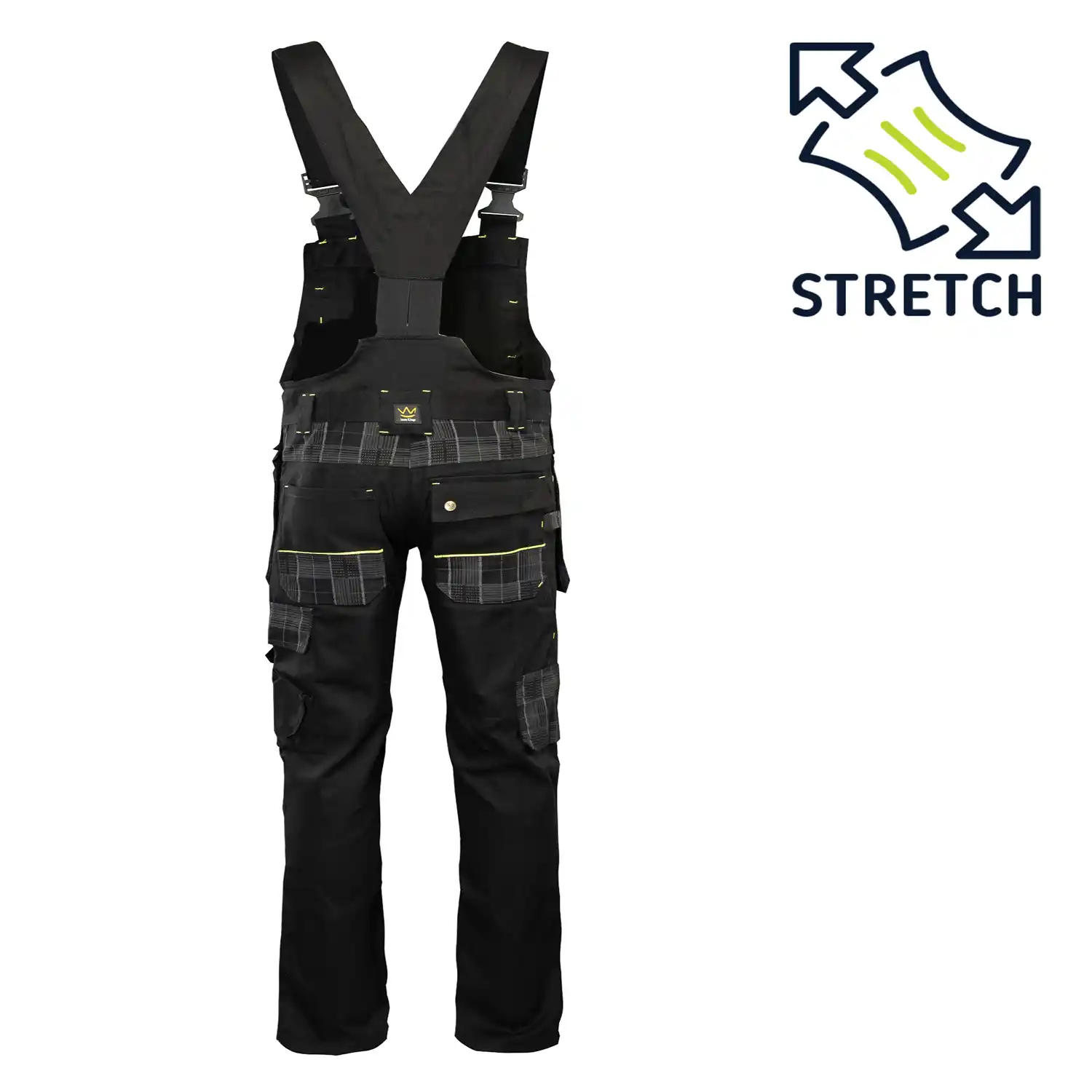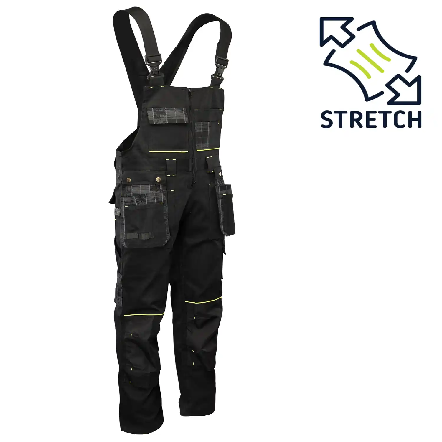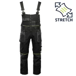 Elastyczne ogrodniczki zgodne z normą EN 13688, wykonane z bawełny z dodatkiem spandexu o gramaturze 300 g/m², wyposażone w praktyczny, długi zamek dwustronny.