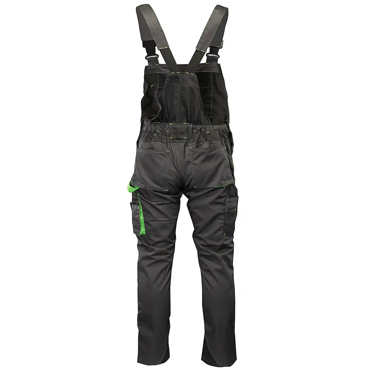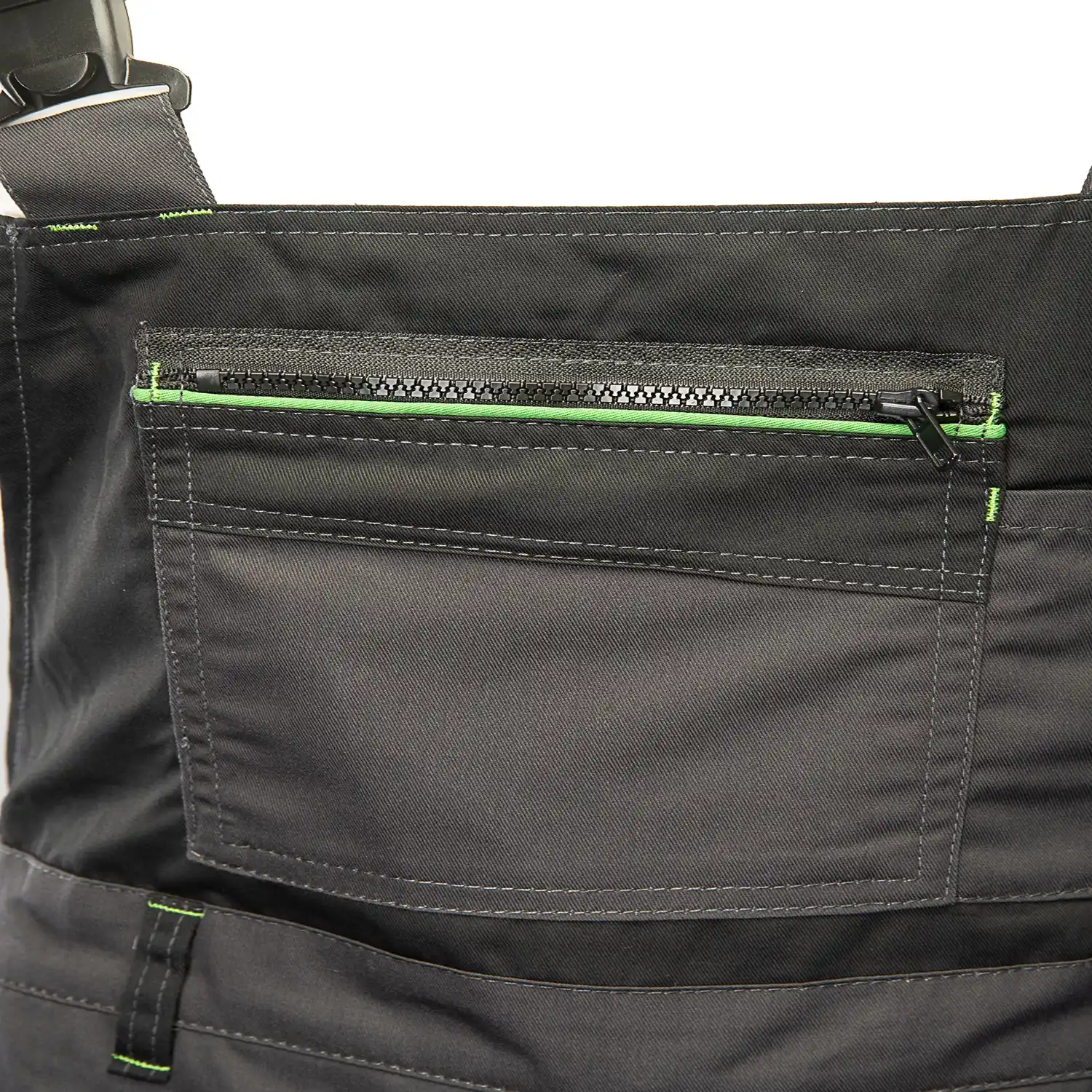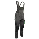 Model charakteryzuje się dużą liczbą praktycznych kieszeni: wzmocnione kieszenie boczne, dwie w tylnej części, kieszeń na dokumenty, telefon komórkowy, długopisy oraz dedykowana kieszeń na miarkę „metrówkę” i szlufka na młotek. Estetykę wykończenia podkreślają wstawki oraz lamówki.