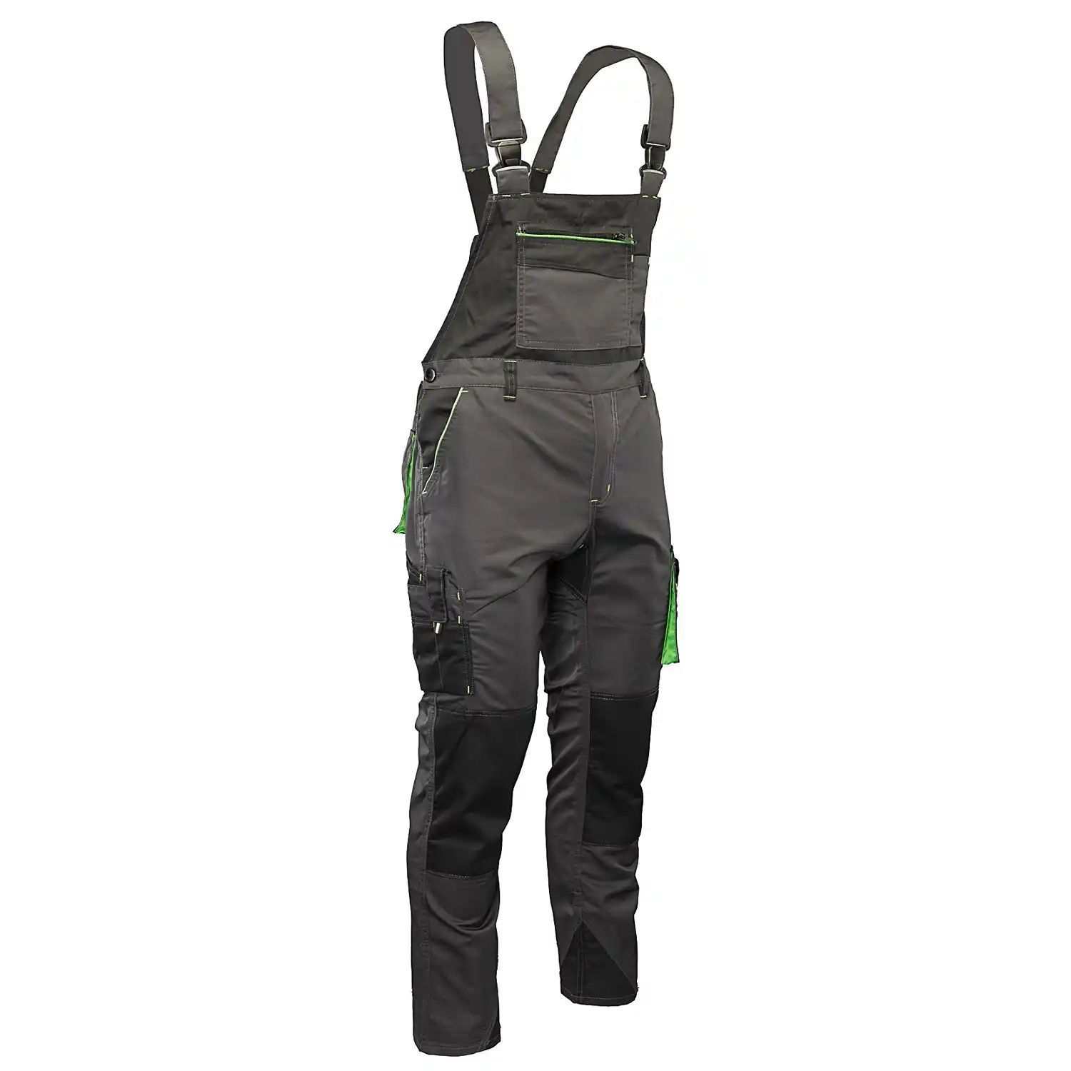 Spodnie robocze ogrodniczki marki Seven Kings, spełniające wymagania normy EN 13688, wykonane są z wysokiej jakości materiału o gramaturze 260 g/m² (skład: 65% poliester, 35% bawełna). Tkanina ta zapewnia stabilność rozmiarów i kolorów nawet po wielokrotnym praniu. Trwałość konstrukcji gwarantują podwójne szwy szyte mocną nicią oraz duża liczba ryglówek w miejscach szczególnie narażonych na rozprucie. Komfort noszenia zapewniają długie, szerokie szelki z regulacją, a funkcjonalność podnoszą ergonomiczne kieszenie na nakolanniki.