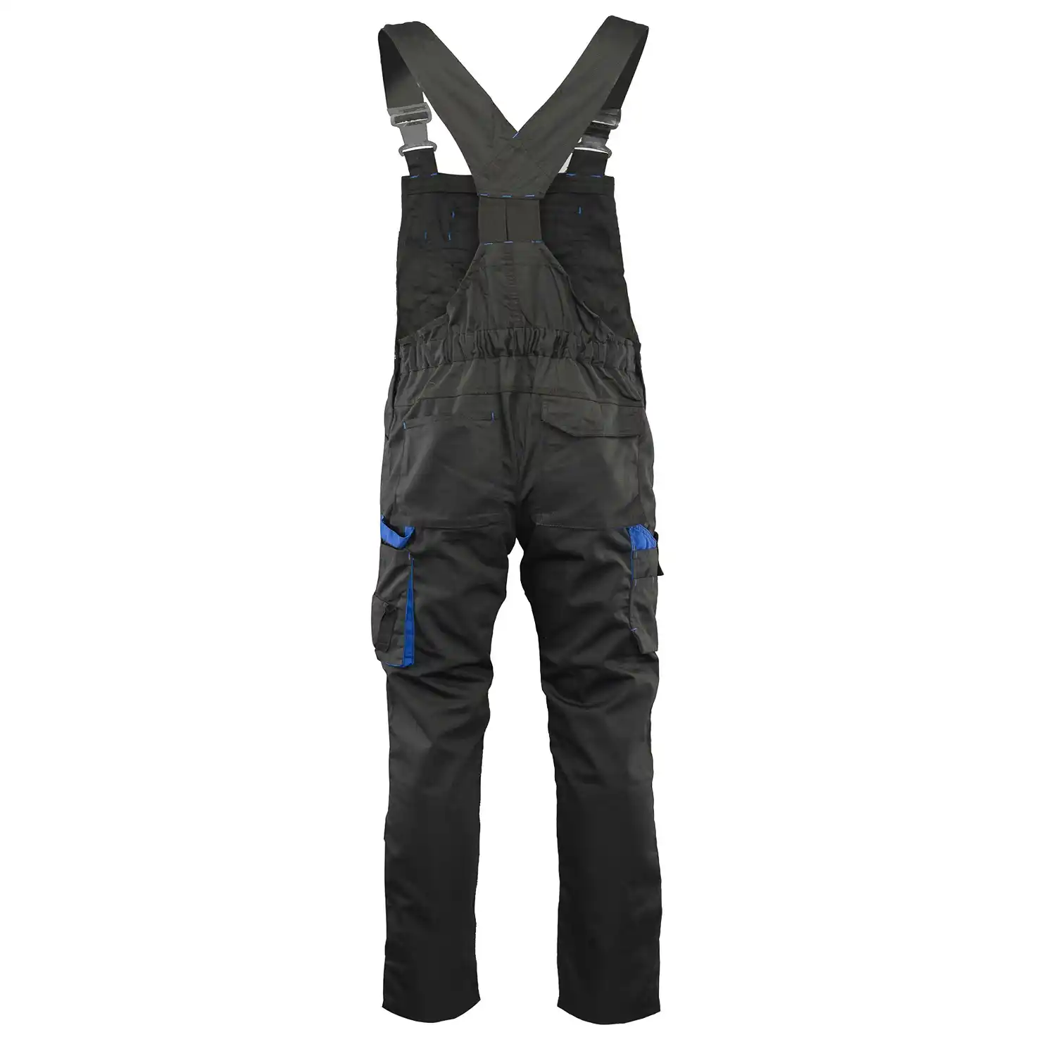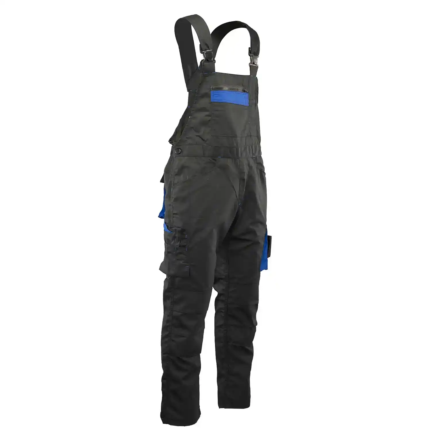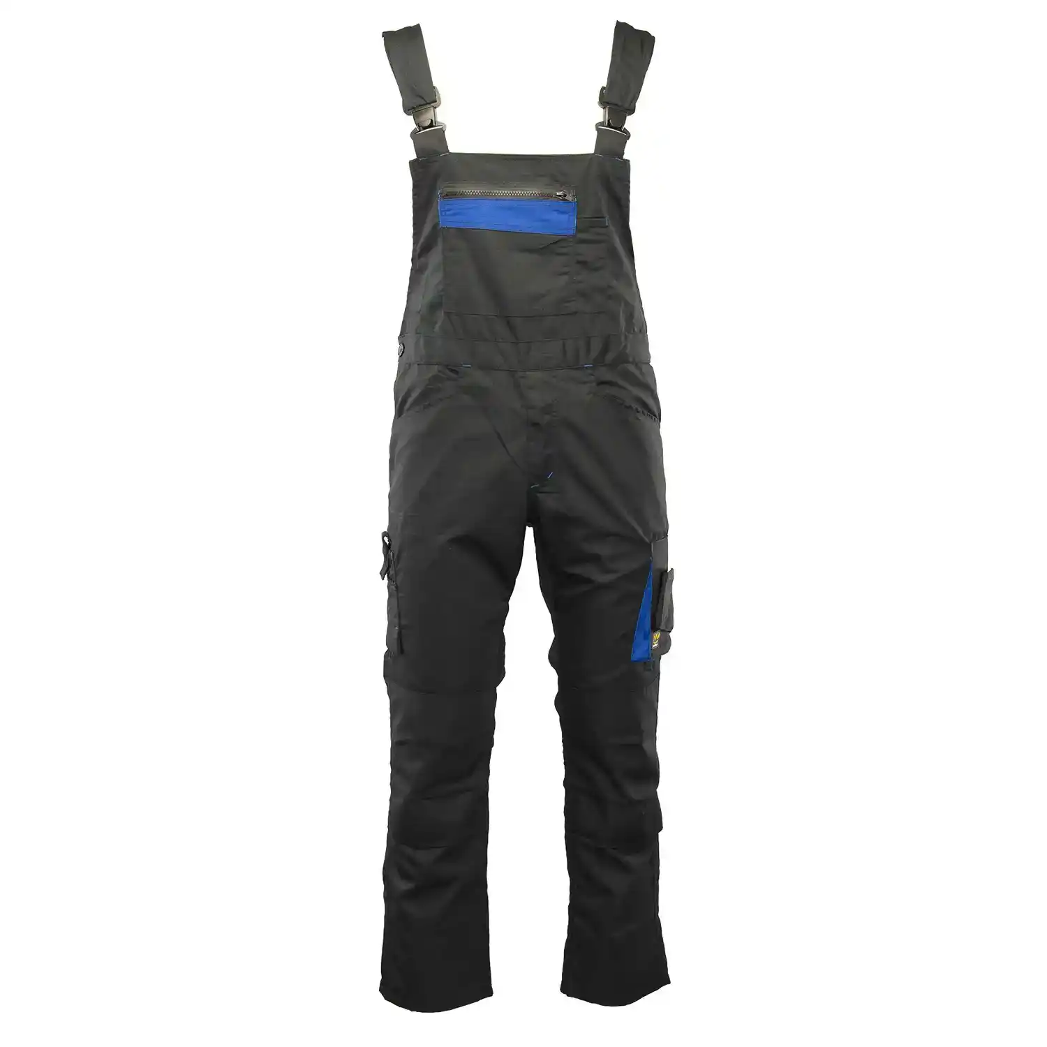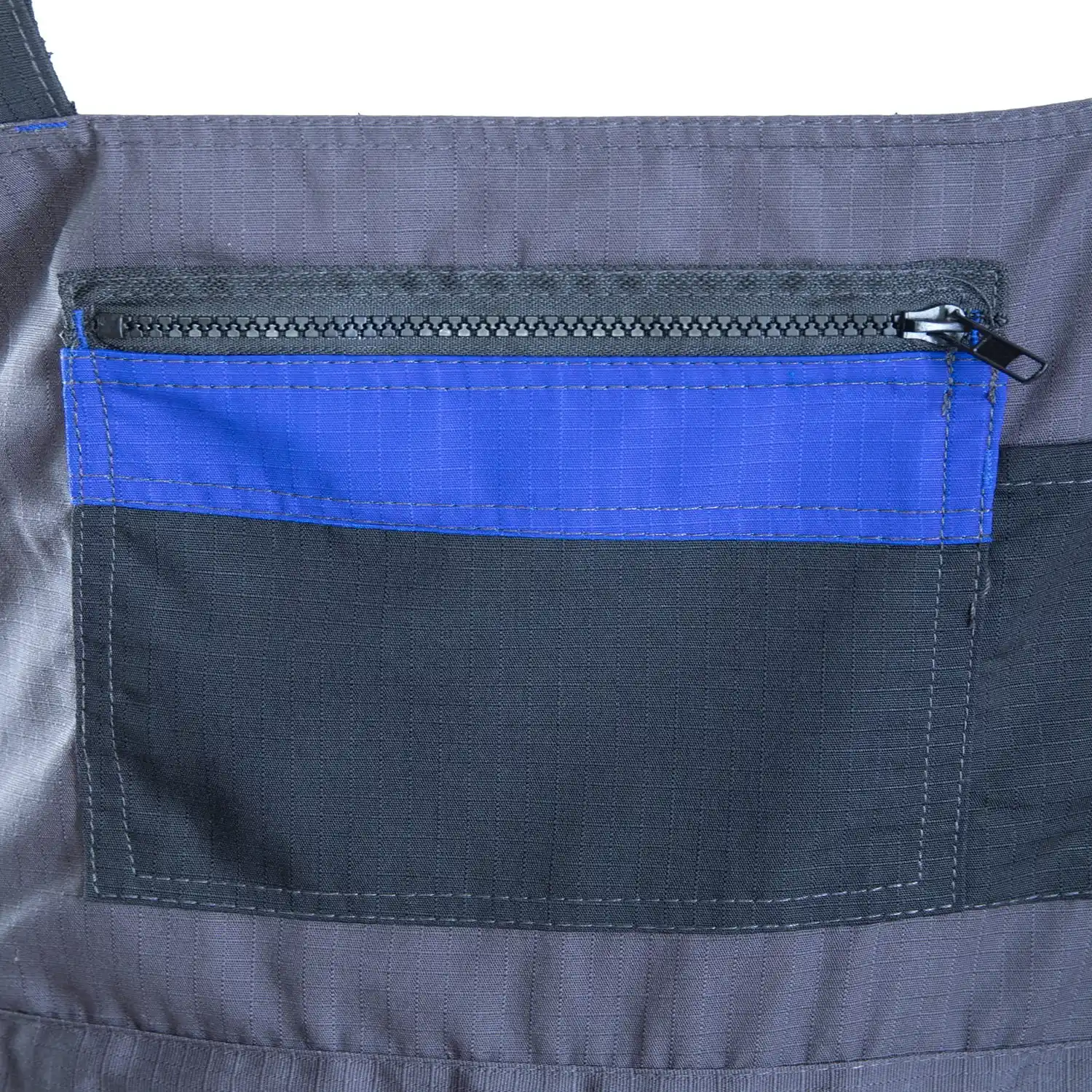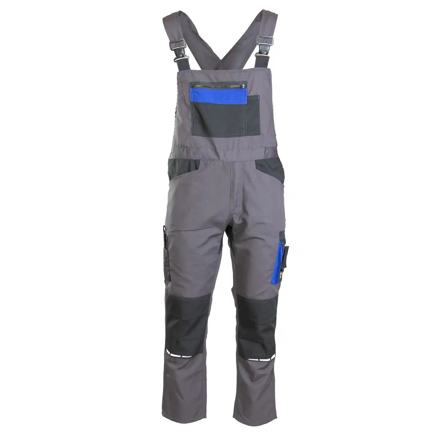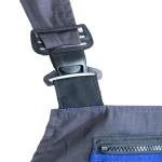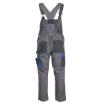 z tkaniny typu rip-stop o gramaturze 260 g/m² (65% poliester, 35% bawełna), której charakterystyczna faktura kratki 6x6mm skutecznie zapobiega rozdzieraniu się materiału. Wytrzymałość konstrukcji gwarantują podwójne szwy szyte mocną nicią oraz duża liczba ryglówek w miejscach szczególnie narażonych na rozprucie. Komfort pracy zapewniają długie, szerokie, regulowane szelki oraz możliwość regulacji obwodu w pasie za pomocą guzików i gumki wszytej w tylnej części. Model wyposażono w ergonomiczne kieszenie na nakolanniki oraz system funkcjonalnych schowków, w tym wzmocnione kieszenie boczne, kieszeń na telefon, dokumenty, długopisy