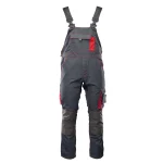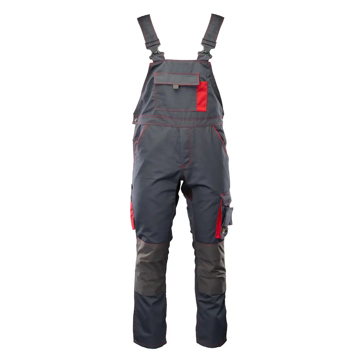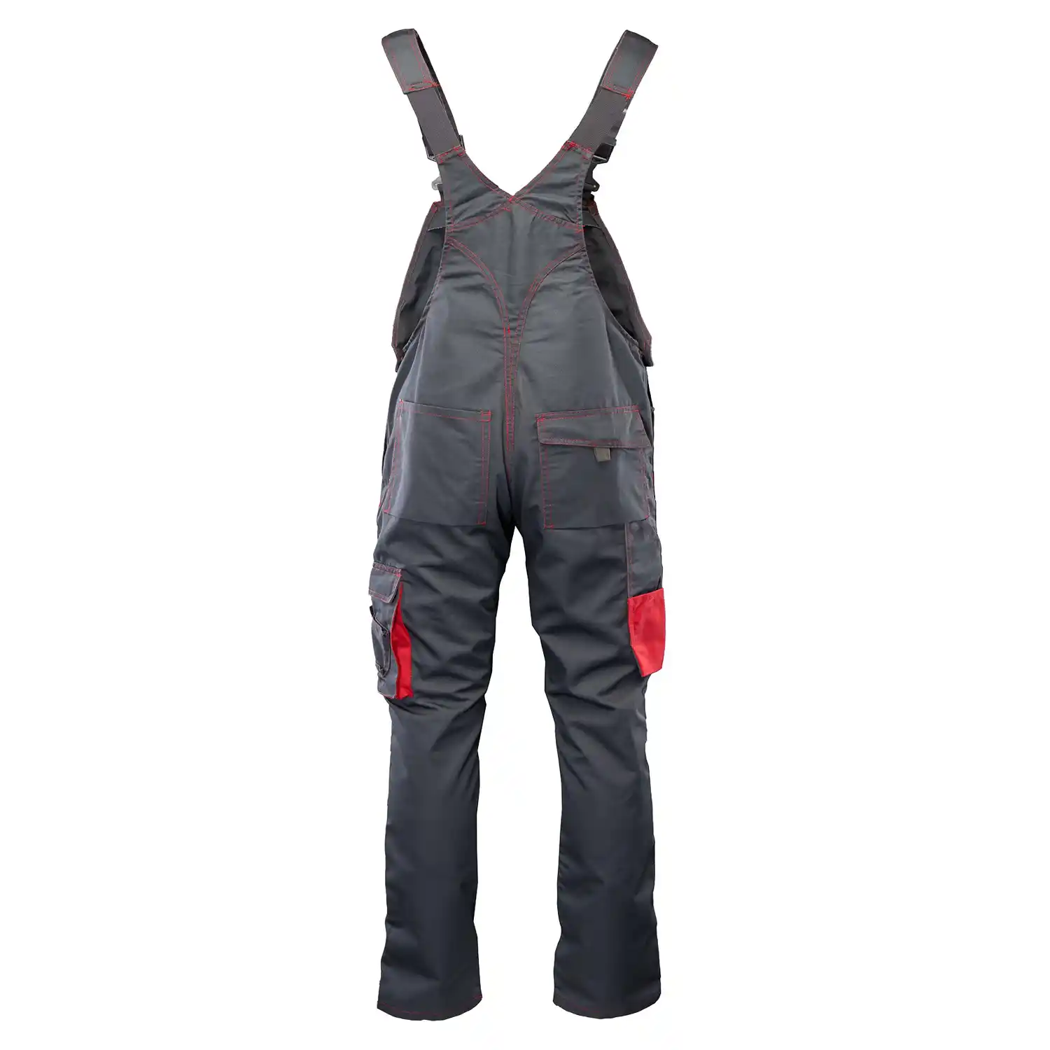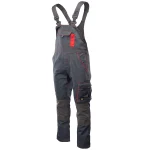 z podwójnymi szwami i licznymi ryglówkami gwarantuje długą żywotność. Funkcjonalność modelu zapewnia system odpinanych kieszeni monterskich oraz dodatkowa, przestronna kieszeń na bawecie, tworząc razem przestrzeń ładunkową na niezbędne narzędzia. Komfort użytkowania podnoszą szerokie szelki z elastyczną gumą oraz regulacja