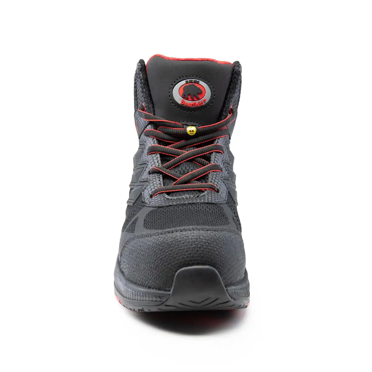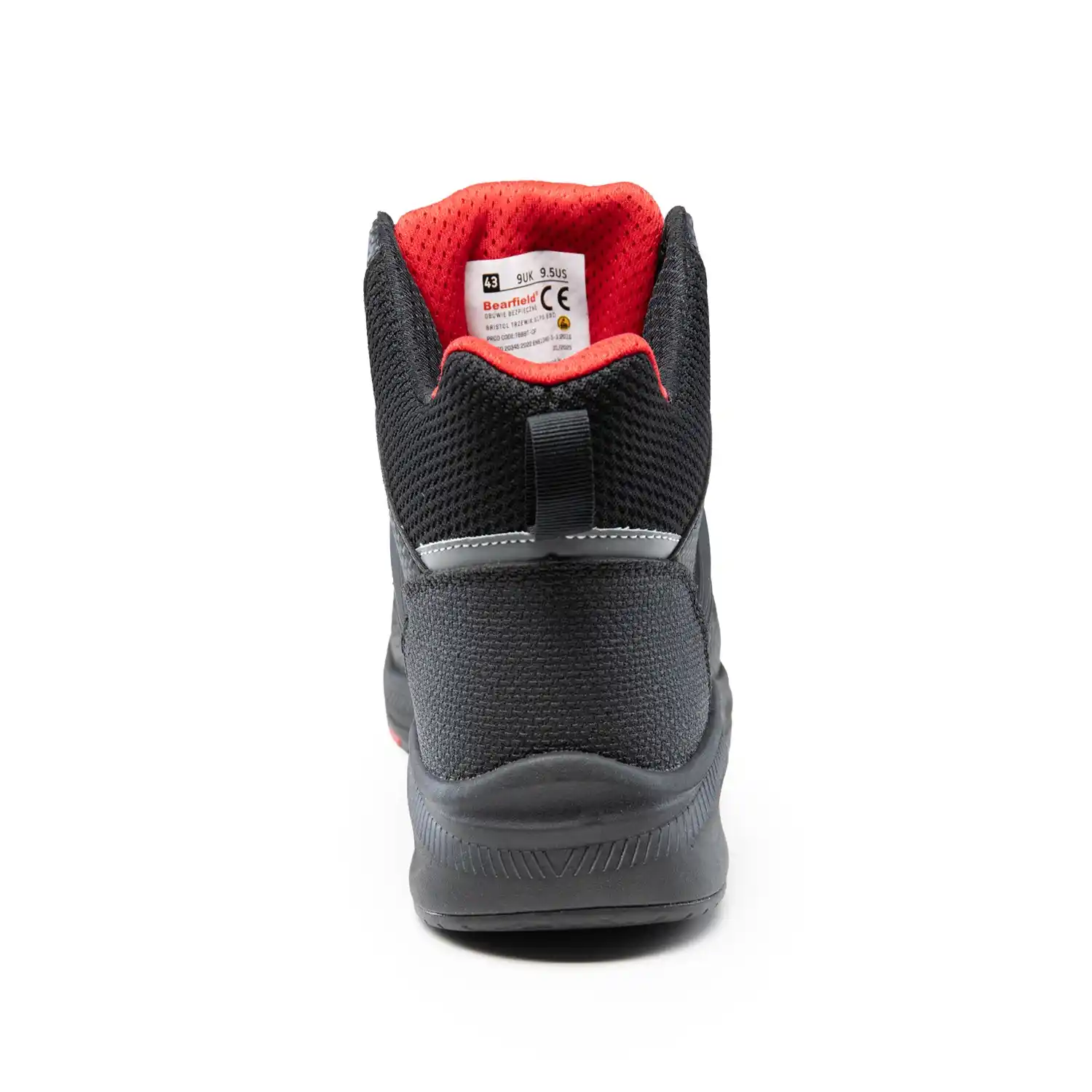 Czarne, wiązane trzewiki robocze za kostkę Bearfield, spełniające wymagania kategorii ochrony S1PS oraz normy EN ISO 20345, zostały wykonane w technologii całkowicie pozbawionej elementów metalowych (Metal-Free). Wierzch obuwia uszyto czarnymi nićmi z superwytrzymałej tkaniny poliestrowej wspartej elementami z TPU oraz mikrofibry. Komfort użytkowania podnosi miękki język oraz higroskopijna, przewiewna wyściółka, która wchłania pot i zapobiega otarciom. Za utrzymanie higieny odpowiada wysokiej jakości, wymienna wkładka premium