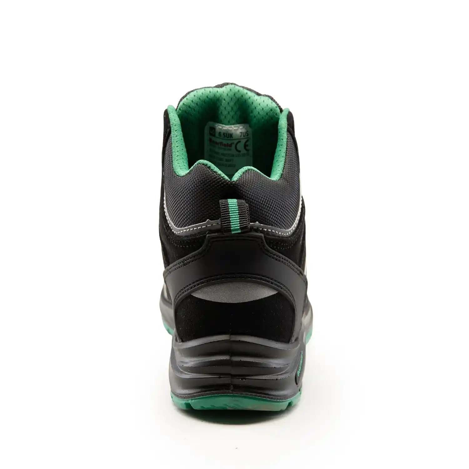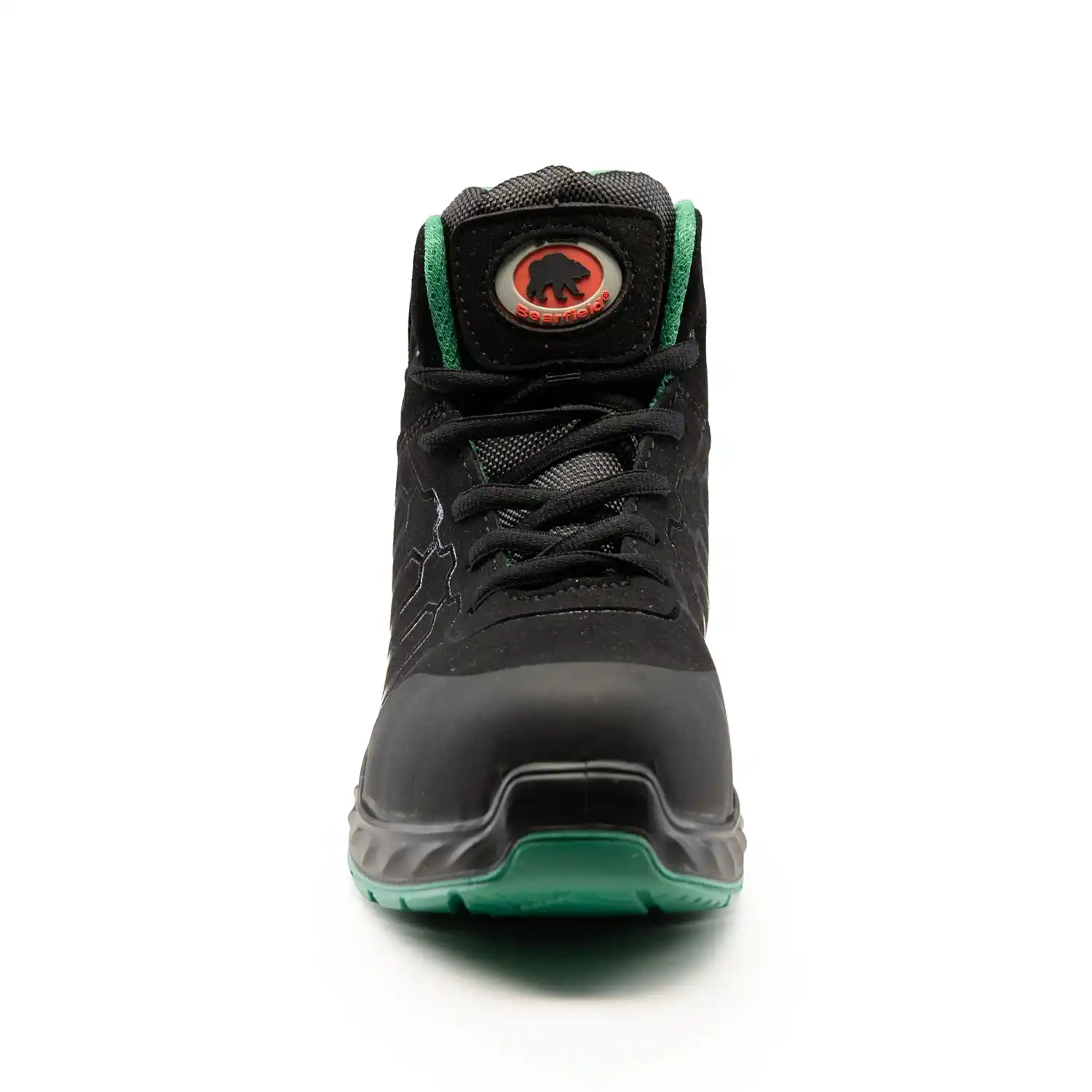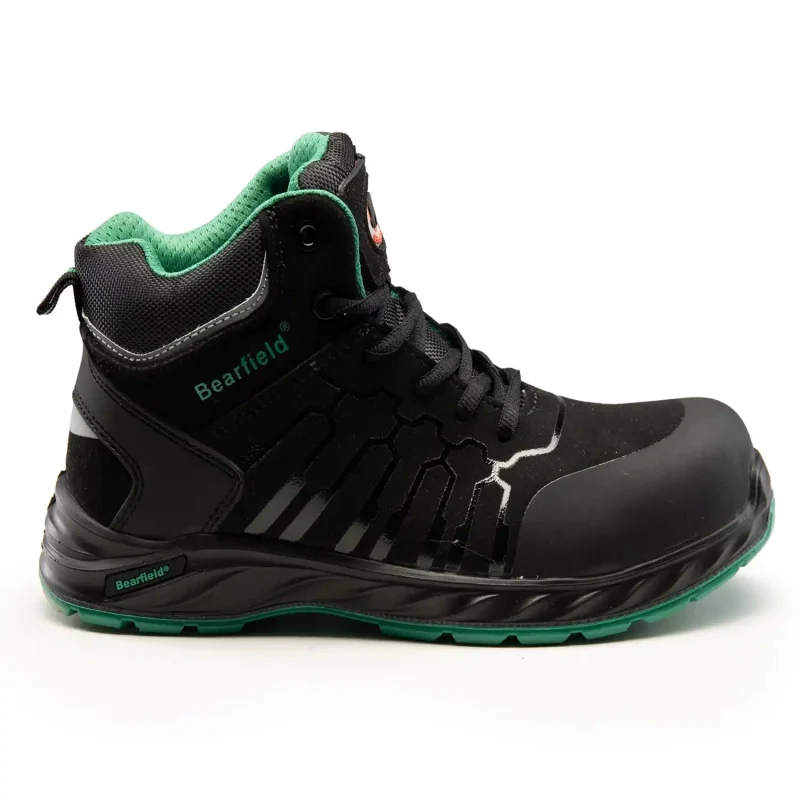 Czarne trzewiki robocze za kostkę Bearfield kategorii ochrony S3S, certyfikowane zgodnie z normą EN ISO 20345. Wierzch obuwia wykonany jest z zaawansowanego materiału mikrofibra o grubości 1,8–2,0 mm, który zapewnia podwyższoną wodoodporność (odporność na absorpcję wody przez 60 min). Jest to model w 100% wolny